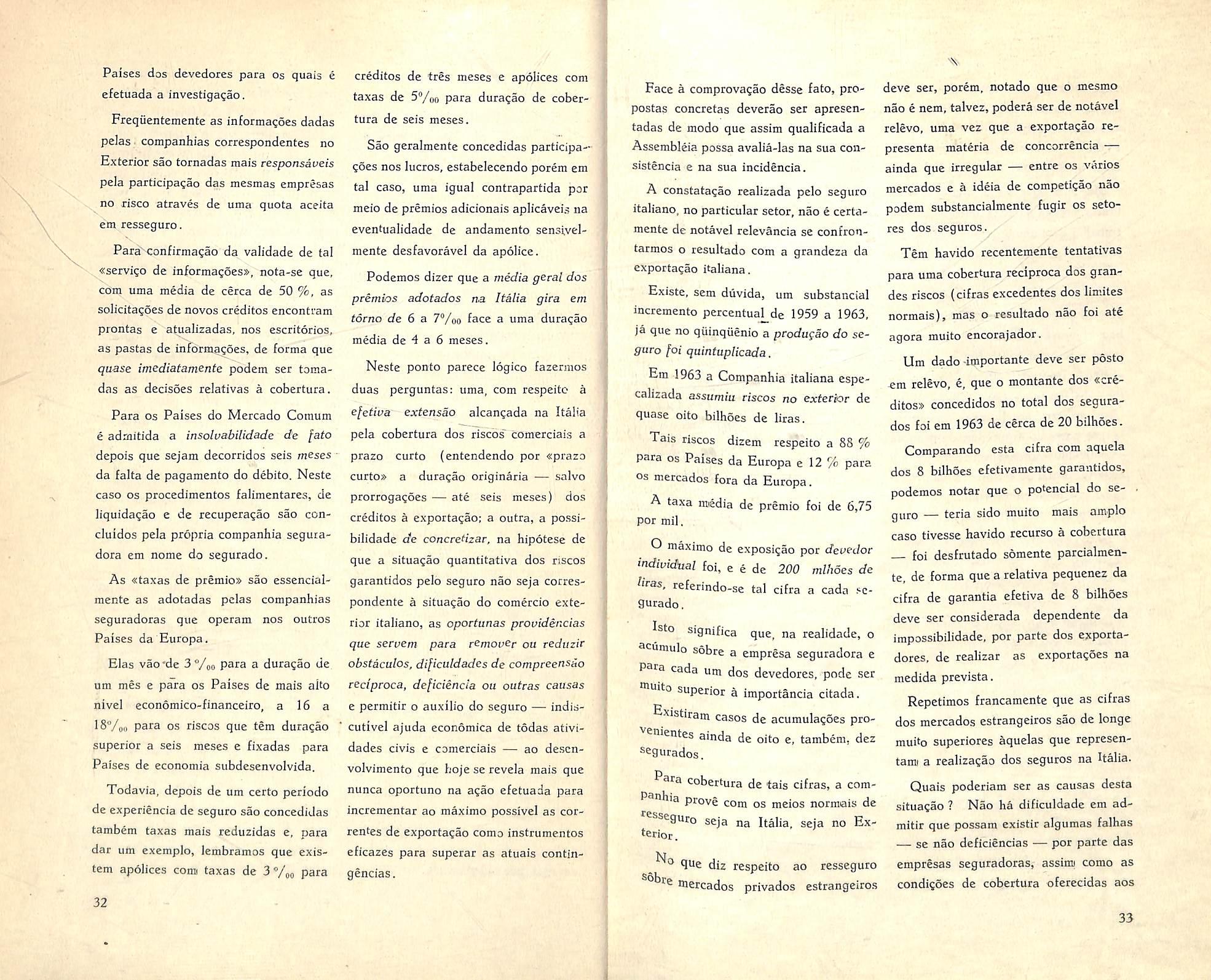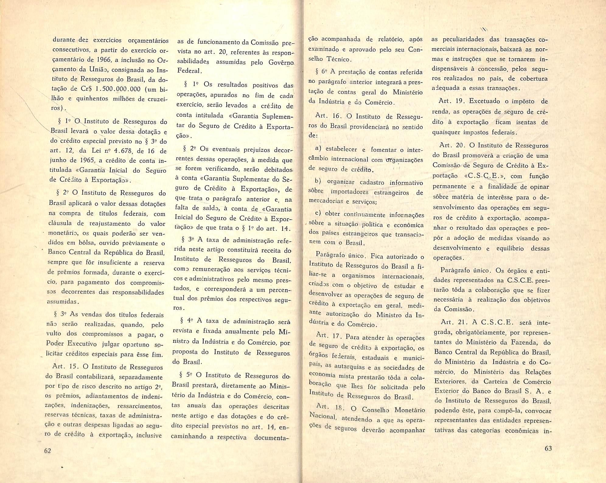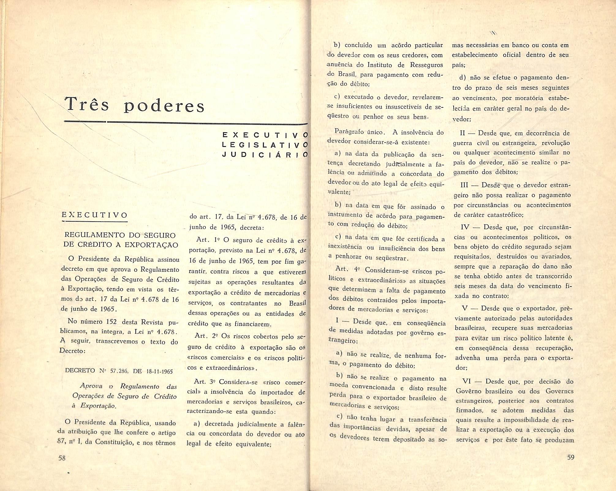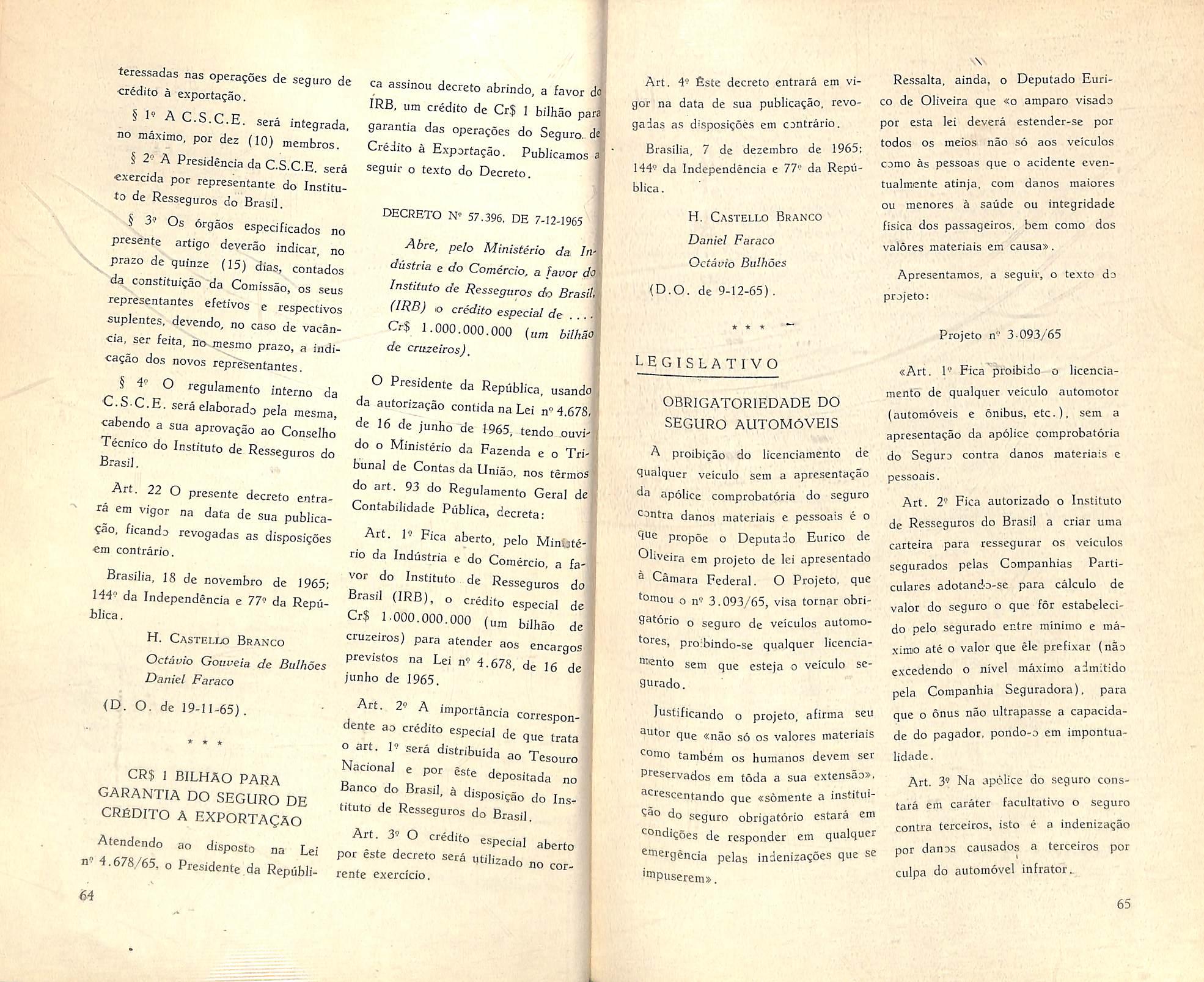 Em 18 de novembro de 1965, o Decreto n" 57.286 do Exmo. Sr. Presidente da Republica veio regulamentar a lei que cri^u o sistema nacional de seguros de credito a exporta^ao, estando agora o I.R.B. empenhado, junto as autoridades competentes, para a ado?ao das providencias compleraentares que possibilitarao o inido das operagoes de segiiros: o recebimento da .dotagao orgamentaria de Cr$, 1.500 000.000 e do credito espe cial de Cr$ 1.000.000.000, bem como a regulamentagao da cobertura dos seguros em moeda estrangeira.