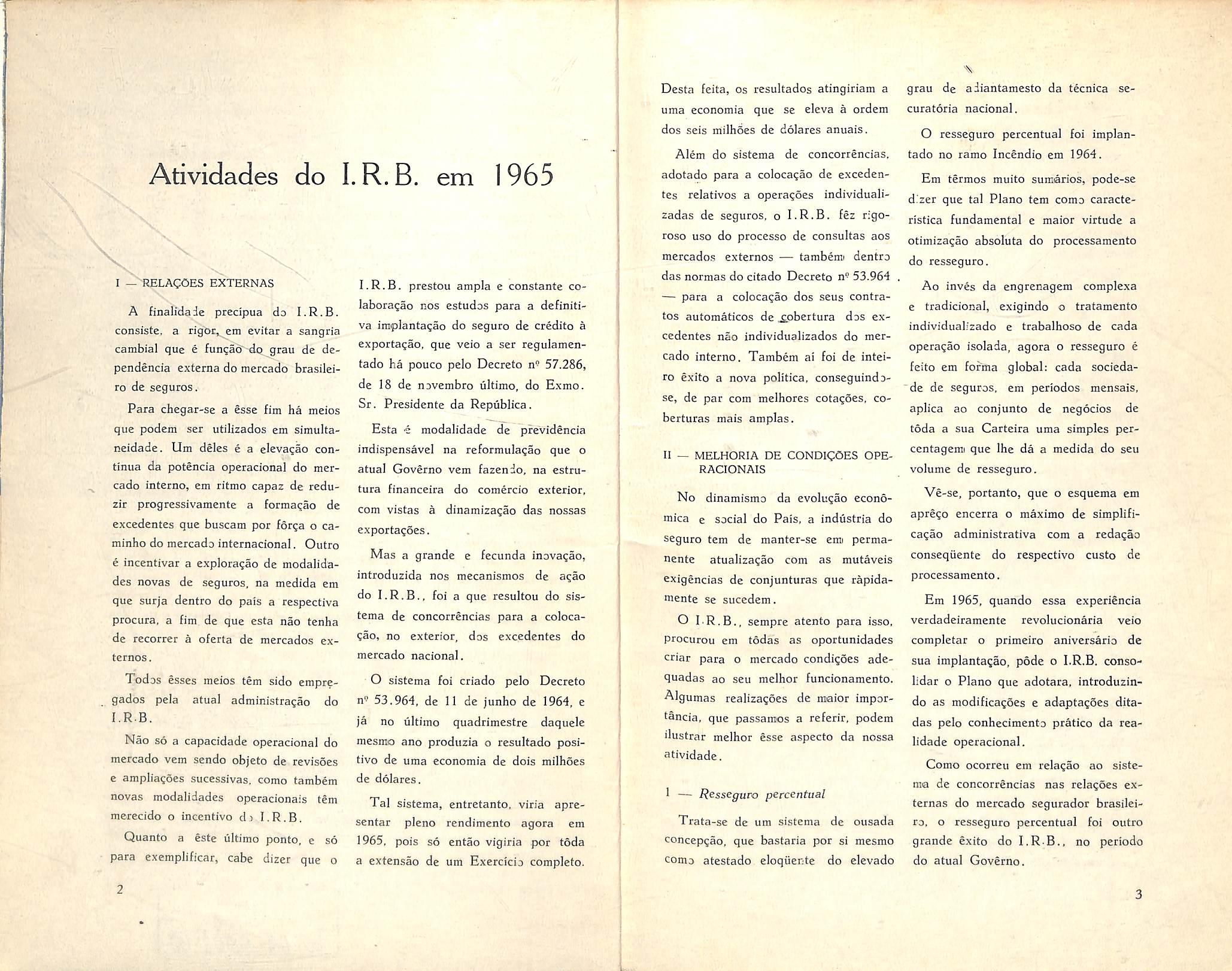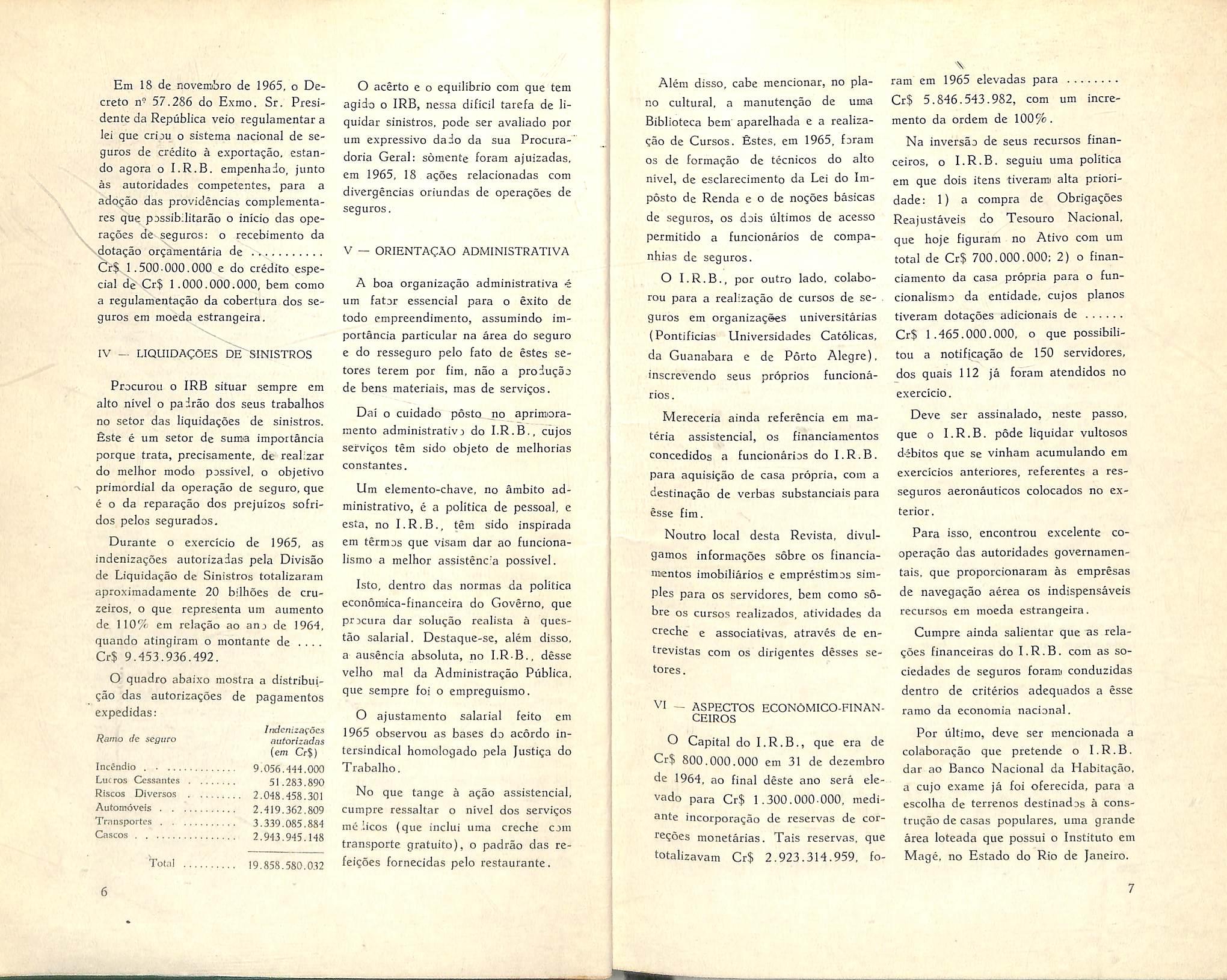 O ano de 1965 foi de trabalho intense e proveitoso no IRB. O sistema de concortencias para as colocagdes externas de ej:cedlenfes do mercado nacional, que pela primeica vez funcionou pot todo um exerclcib, alcangoa o desejado rendimento. proporcionando a econontia nacional do pais uma poupanga de dii>isas da ordem de 6 milhdes de dolares.