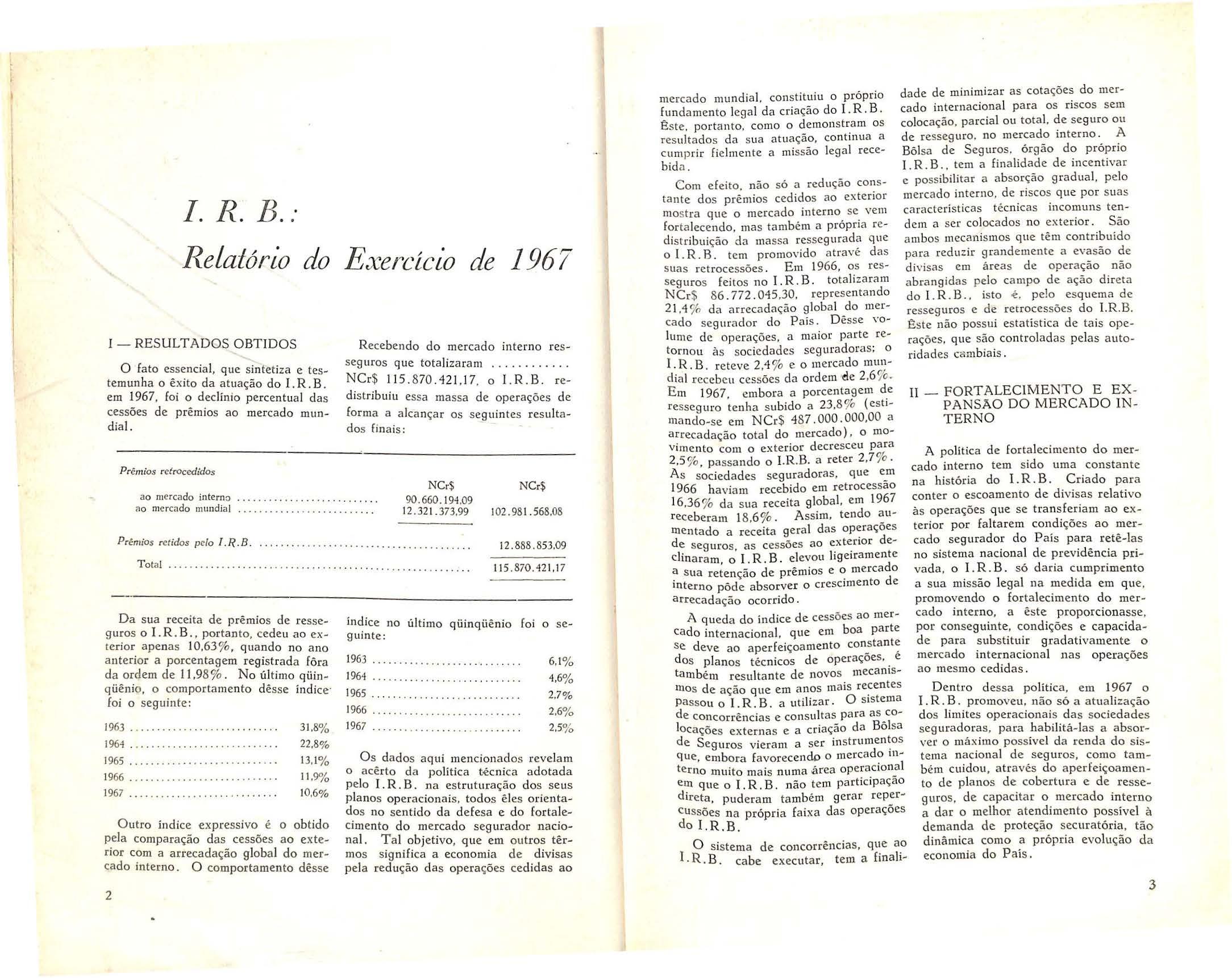 O fato essencial, que sintetiza e testemunha o êxito da atuação do I R. B. em 1967, foi o declínio percentual das cessões de prêmios ao mercado mundial.