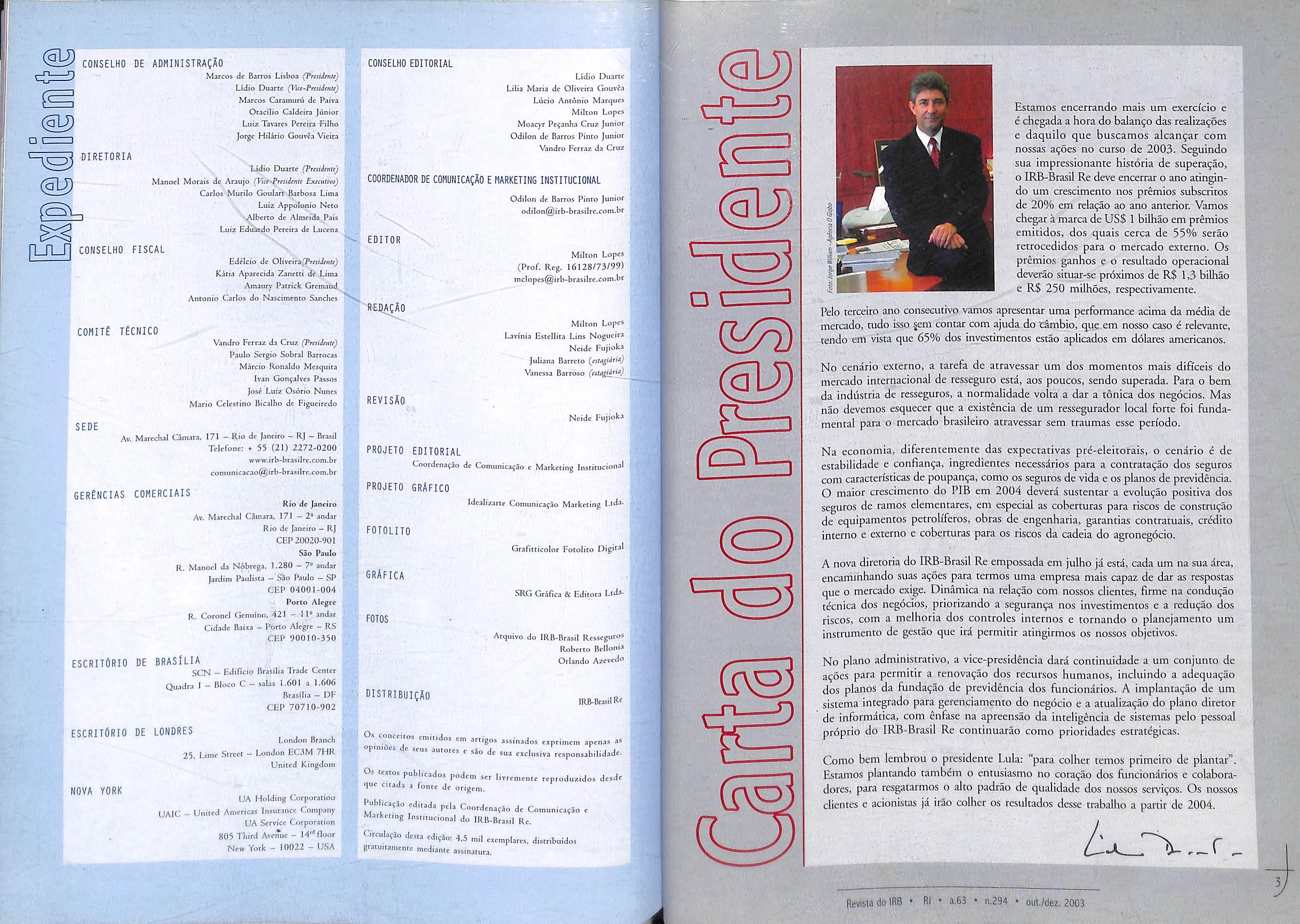 Estamos encerrando mais um exerc/cio e 6 chegada a hora do balantjo das realiza^ocs e daquiio que buscamos aicangar com nossas a^oes no curso de 2003. Seguindo sua impressionante historia de supera^ao, o IRB-Brasil Re deve encerrar o ano atingindo um crescimento nos premios subscricos de 20% em rela^ao ao ano anterior. Vamos chegar a marca de US$ I bilhao em premios emicidos, dos quais cerca de 55% serao retrocedido.s para o mercado exrerno. Os premios ganhos e o resukado operacional deverao situar-se prdximos de RS 1,3 billwo e R$ 250 milhoes, respeaivamente.