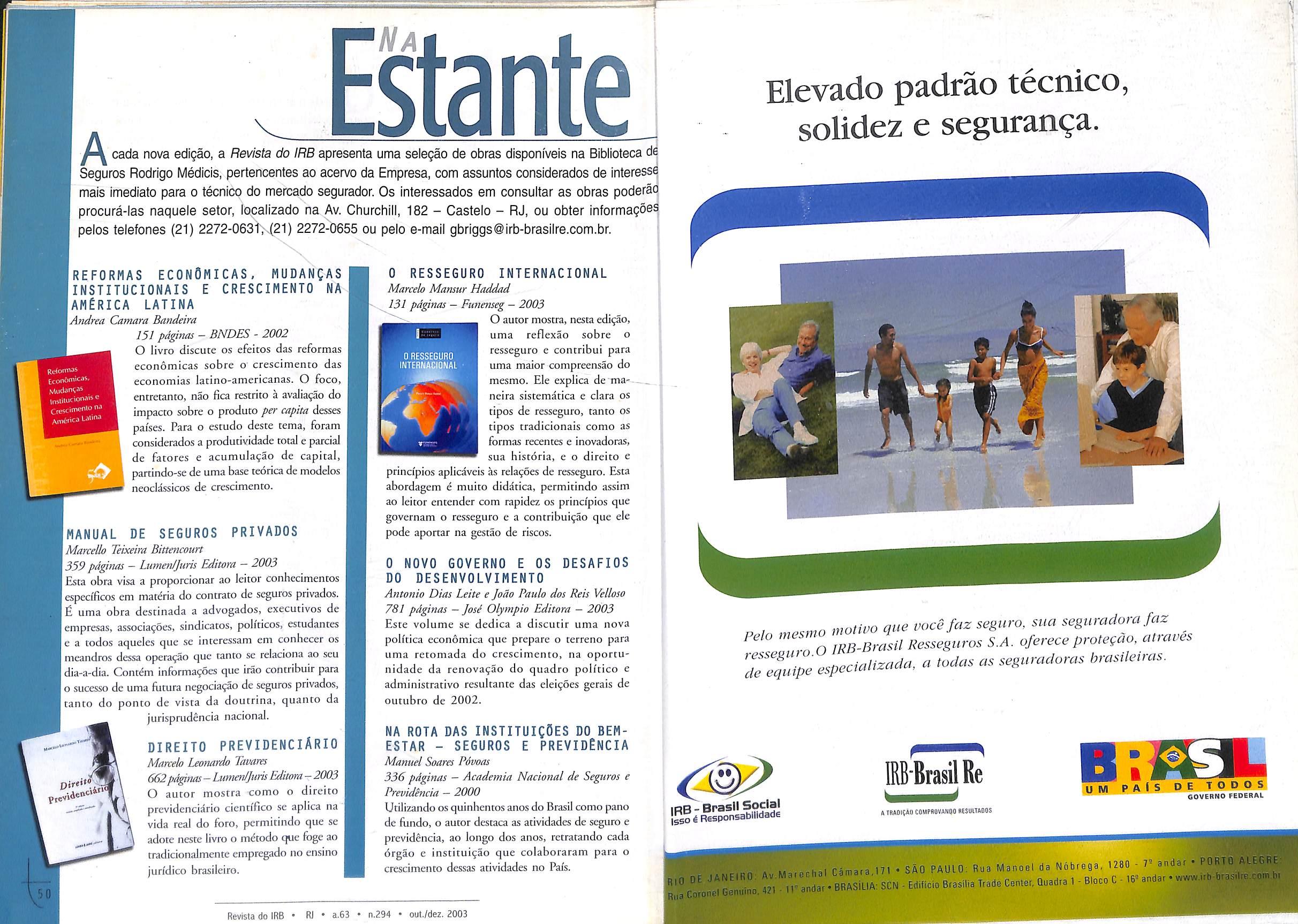 cada nova edi^ao, a Revista do IRB apresenta uma seiegao de obras disponiveis na Biblioteca de Seguros Rodrigo Medicis, pertencentes ao acervo da Empresa, com assuntos considerados de interesse mais imediato para o tecnioo do mercado segurador. Os interessados em consultar as obras poderao. procura-las naquele setor, [ocalizado na Av. Churchill, 182 - Castelo - RJ, ou obter informagoes pelos telefones (21) 2272-063l>.(21) 2272-0655 ou pelo e-mail gbrlggs@irb-brasilre.com.br.