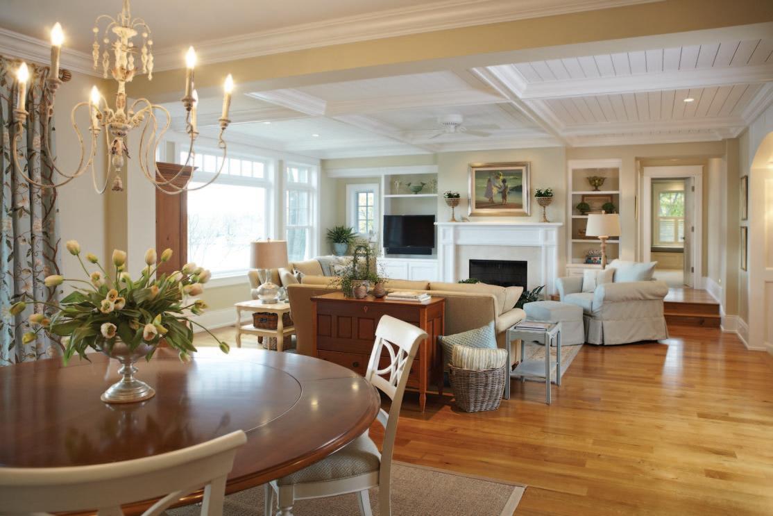 Each space has definition through the use of window placement and unique ceiling details. The living room features a coffered ceiling, while the dining area features a serving bar to separate it from the kitchen area with custom columns and crown moulding from
