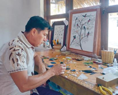 the world for ceremonial, ritual, and traditional purposes. Flores says his work represents “The taste for birds and their plumage; the continuity of an art that was highly appreciated and admired in Mexico and that few of us keep alive, in each piece, the delicacy, the fragility of the feather, and at the same time, the beauty that can be obtained. Each creation, whether decorative or utilitarian, represents an entire heritage and tradition with the work of the pen that has been worked for centuries in Mexico.”