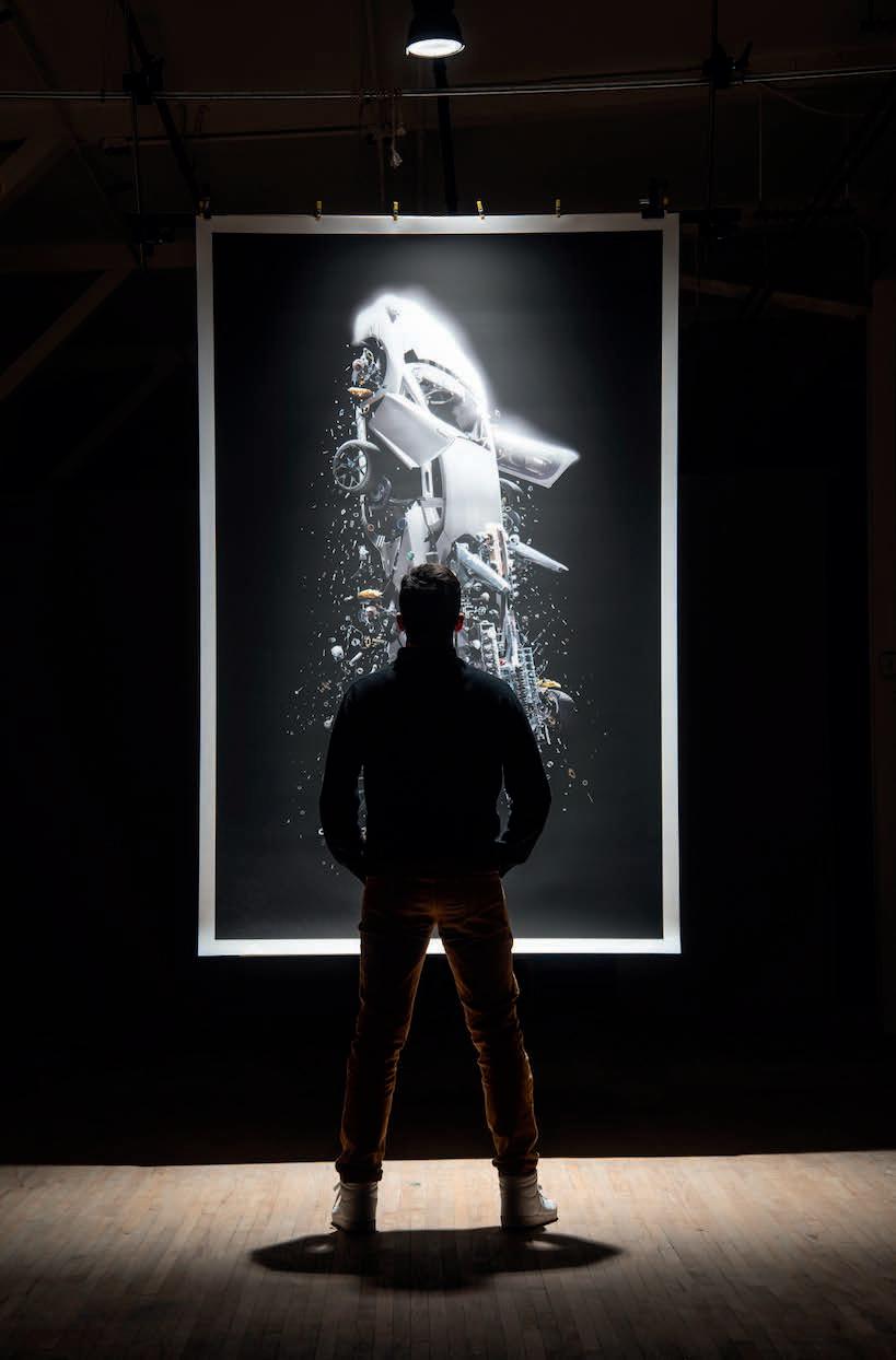 This was one of the earlier concepts I developed, and it started when I was working on a car that I needed to fix – a fuel pump that I needed to replace. I looked at the exploded view of this fuel pump. Usually, those drawings are made by engineers to explain the details of the car and how each component work. So I looked at this drawing of a fuel pump in this exploded view. It made me want to do the same with photography by recreating this aesthetic. That’s how this disintegration was born! In addition, I was reflecting a lot about time and how we perceive it through photography – a medium that is particularly accurate in stopping time and making it visible. By combining the idea of an exploded view combined with photography, a moment stopped in time, this idea of disintegrating became quite clear: to create an artificial moment that looks hyper realistic and yet never really existed.