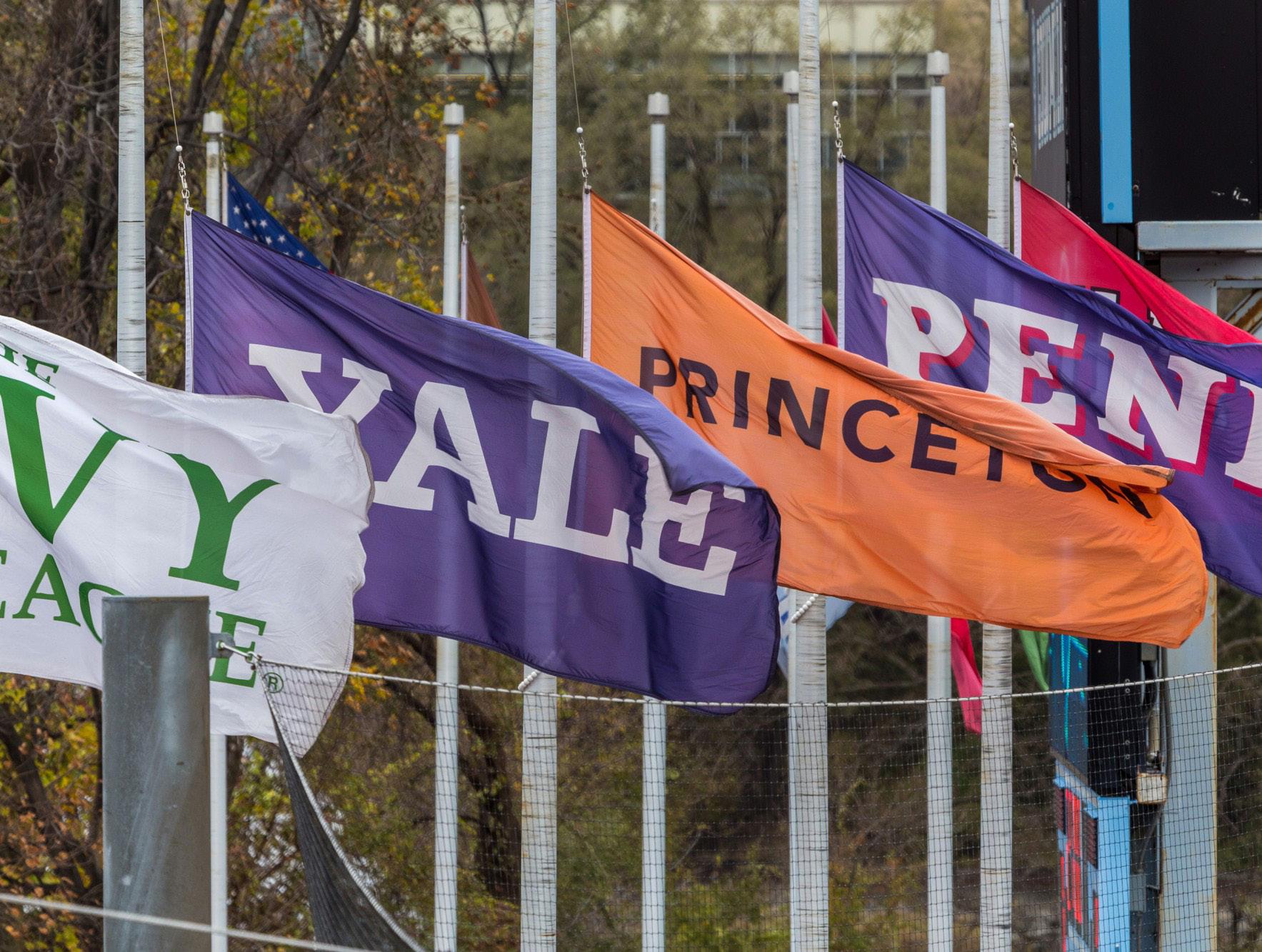 Flags for the Ivy League schools fly at Columbia University’s Lawrence A. Wien Stadium in New York on Nov. 17, 2018.