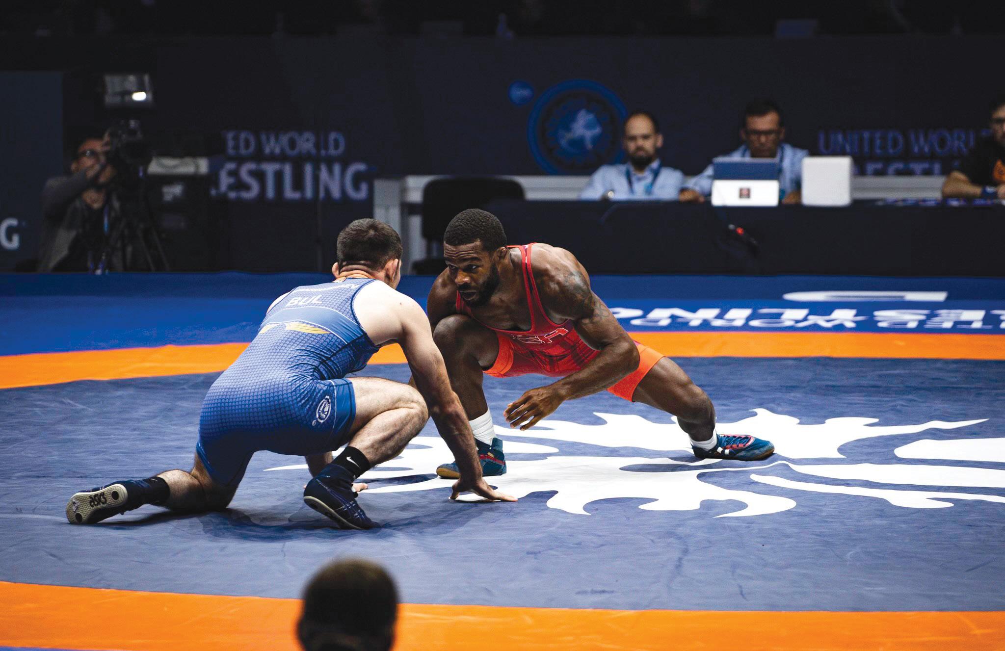 Jordan Burroughs lunges toward opponent Ali Umarpashaev of Bulgaria at the 2022 World Wrestling Championships in Serbia on Sept. 15
