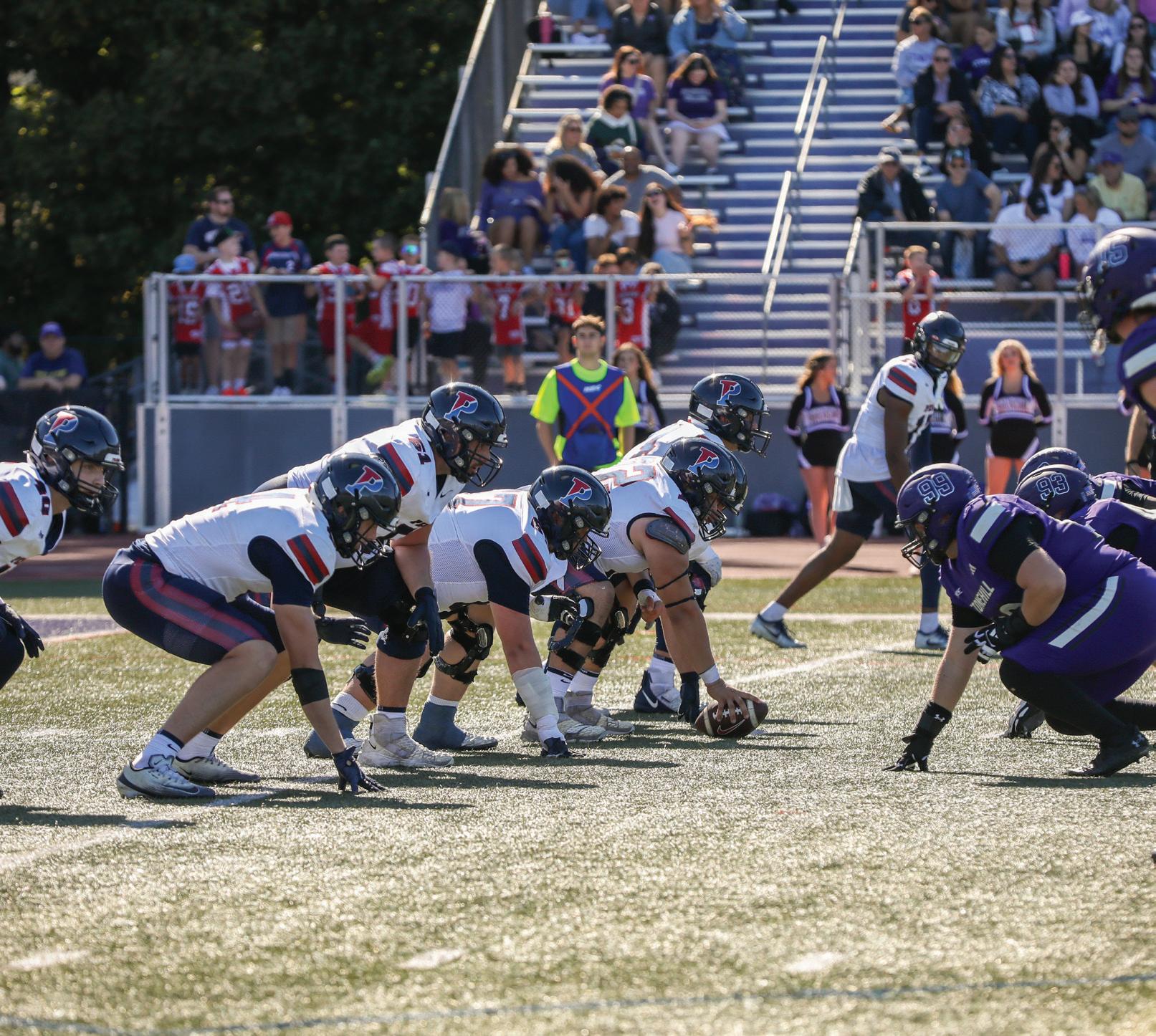 Penn’s offensive line pictured before a play at Stonehill on Sept. 20.
