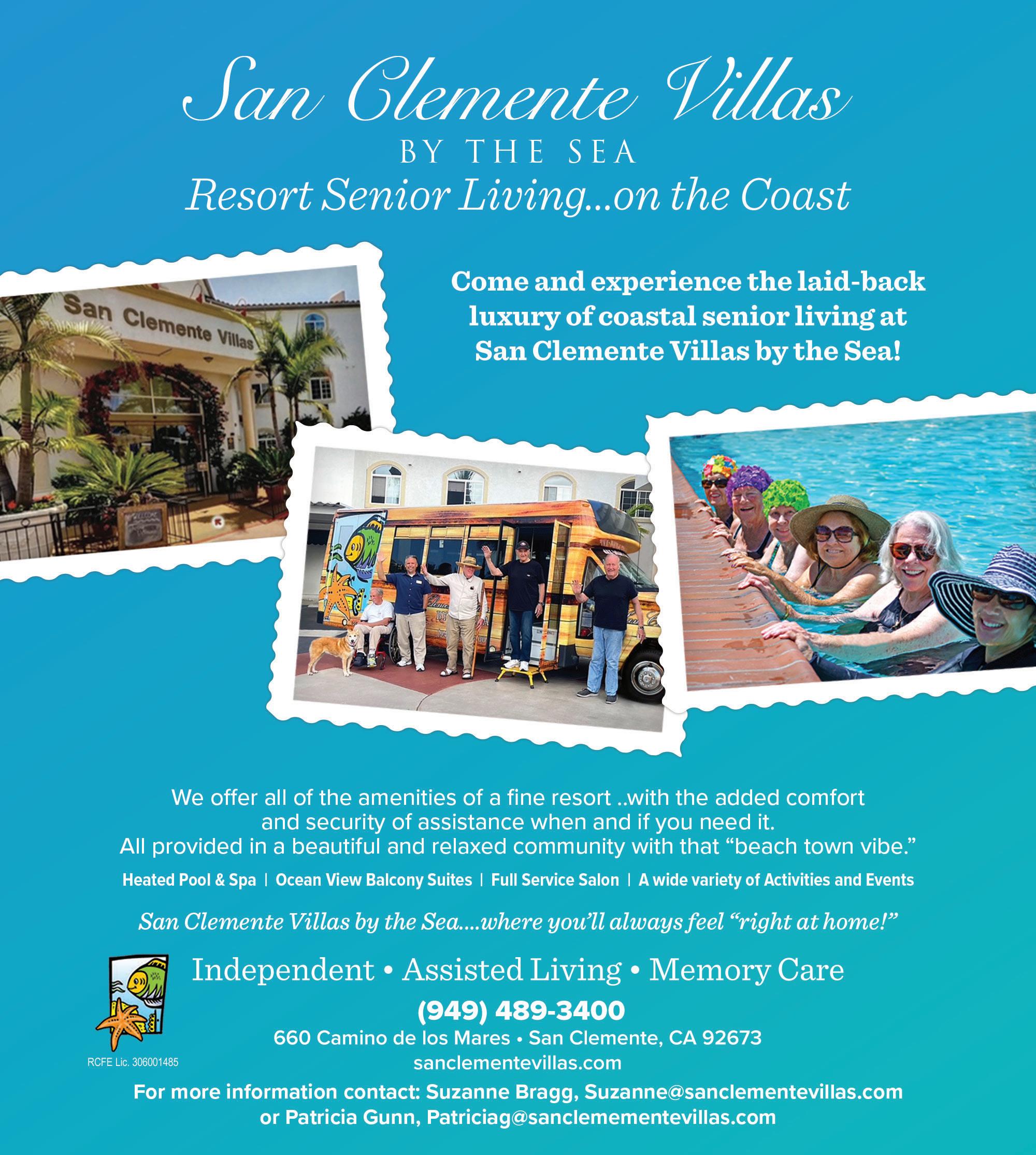 The San Clemente Villas by the Sea leads off the next slate, providing retirement living and assisted care for seniors in studios and one- and two-bedroom apartments. On-site is a Patient Extended Care Unit designed to care for those with Alzheimer’s, Parkinson’s disease, Vascular Dementia or other related afflictions.