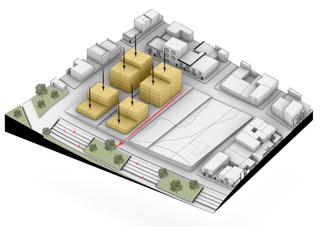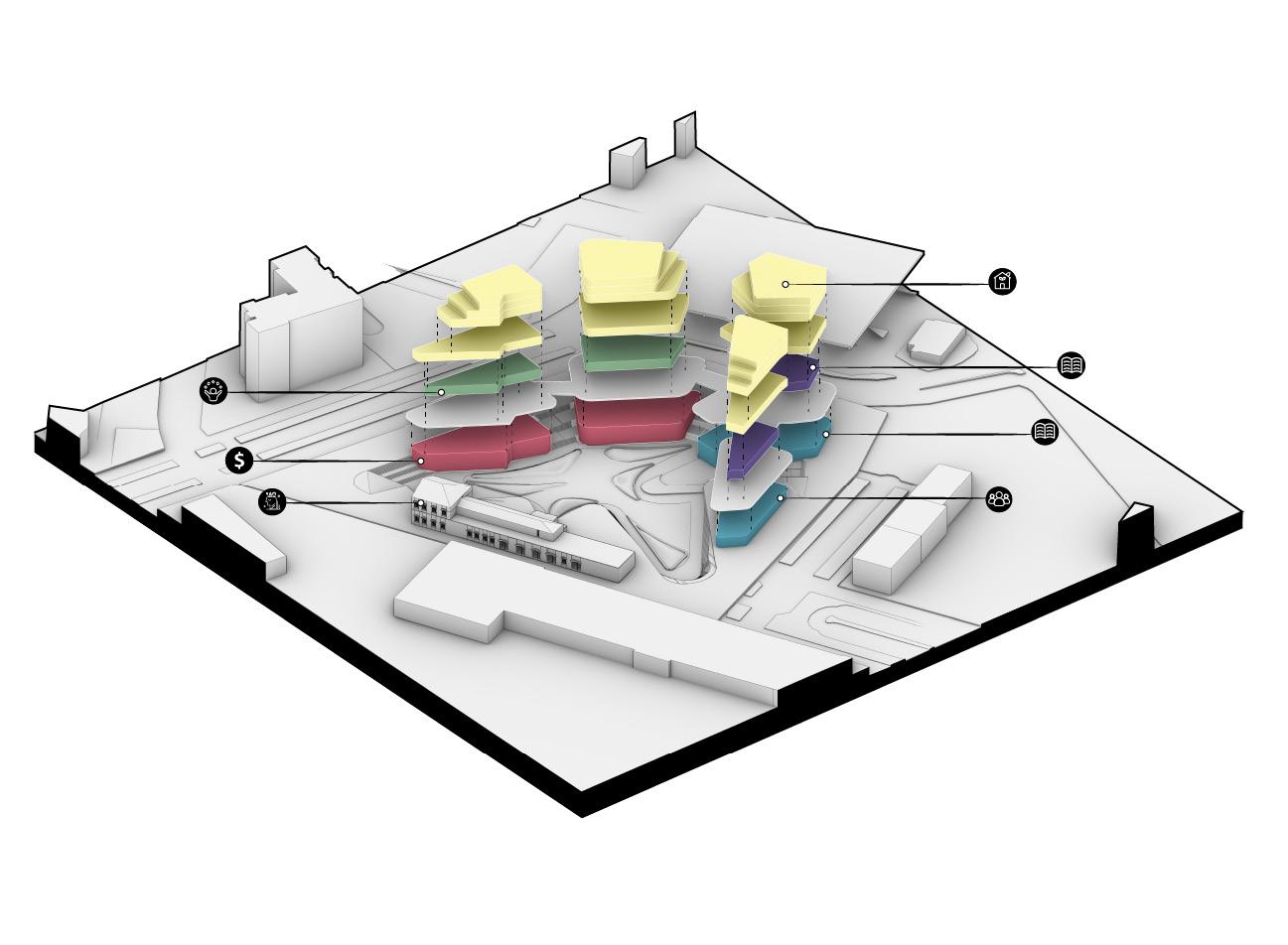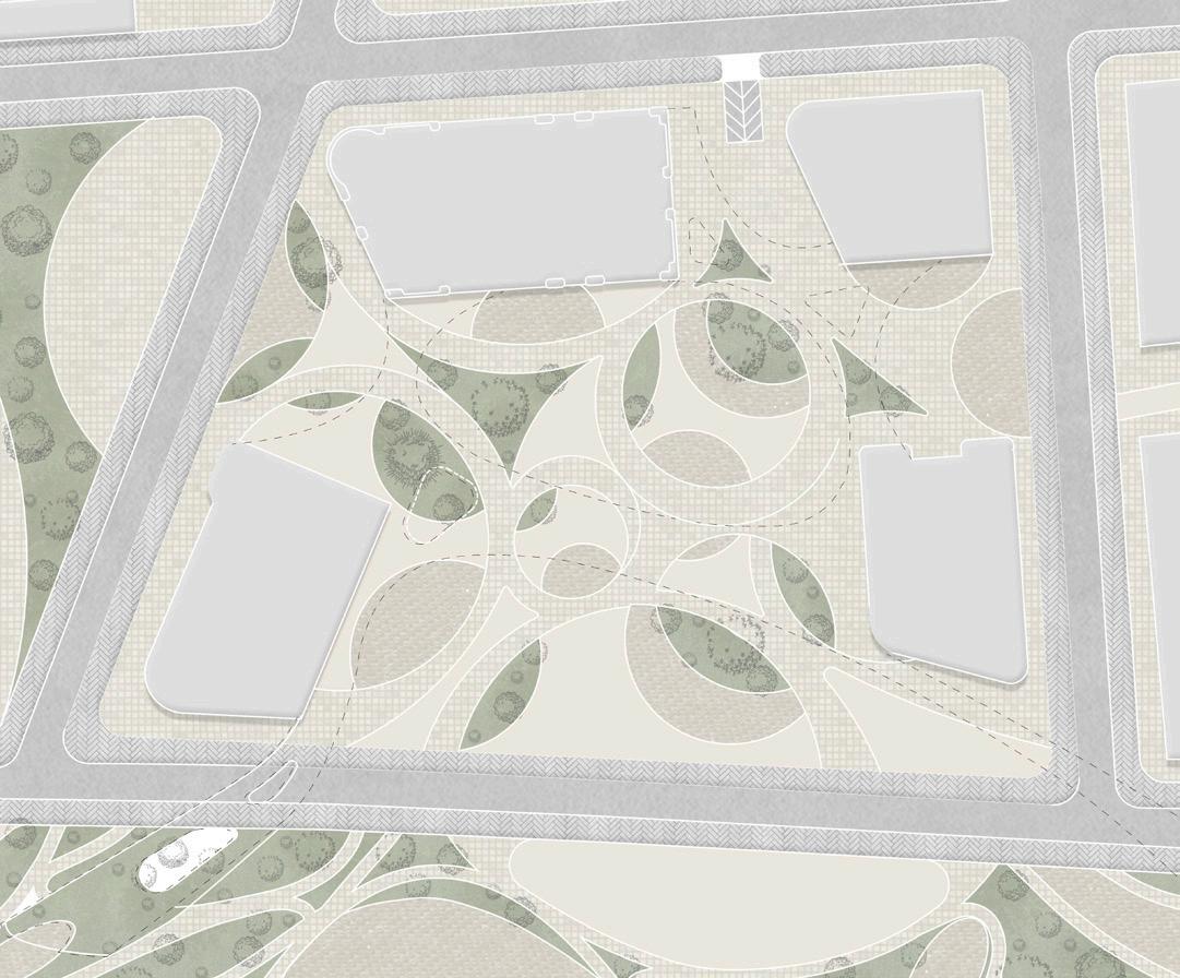En el recinto se buscó integrar el sistema natural preexistente transformándolo en un parque lineal donde se vuelca la actividad hacia el río. Los edificios se abren a este parque y busca conexión con la malla roja de centralidades en la parte central de la célula, así mismo los edificios se conectan por medio de una plataforma que permite el intercambio de usos. por último. la configuración de estos edificios mas la plataforma, da como resultado un espacio para la integración de los distintos usuarios del recinto
