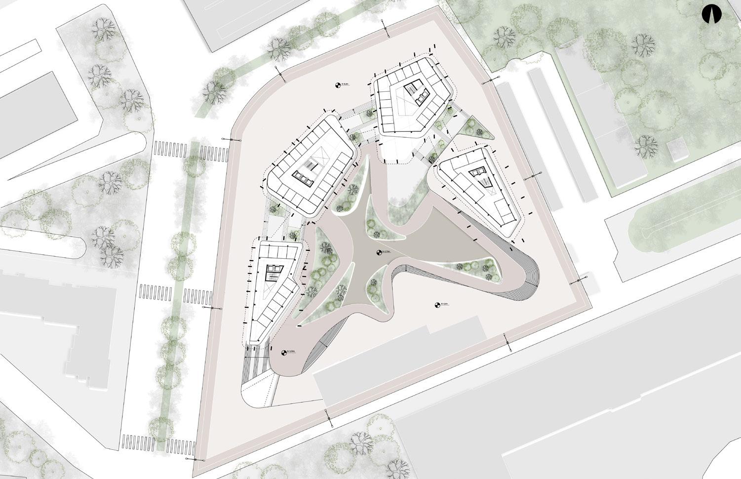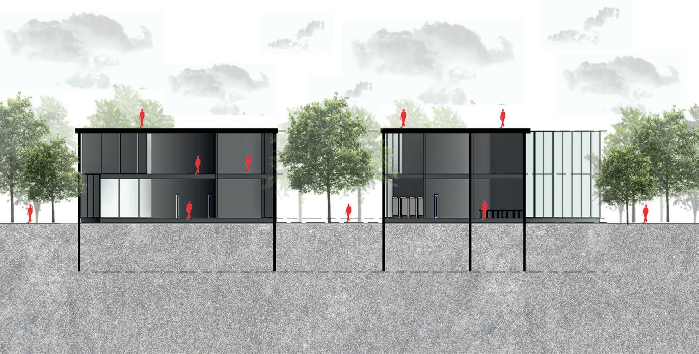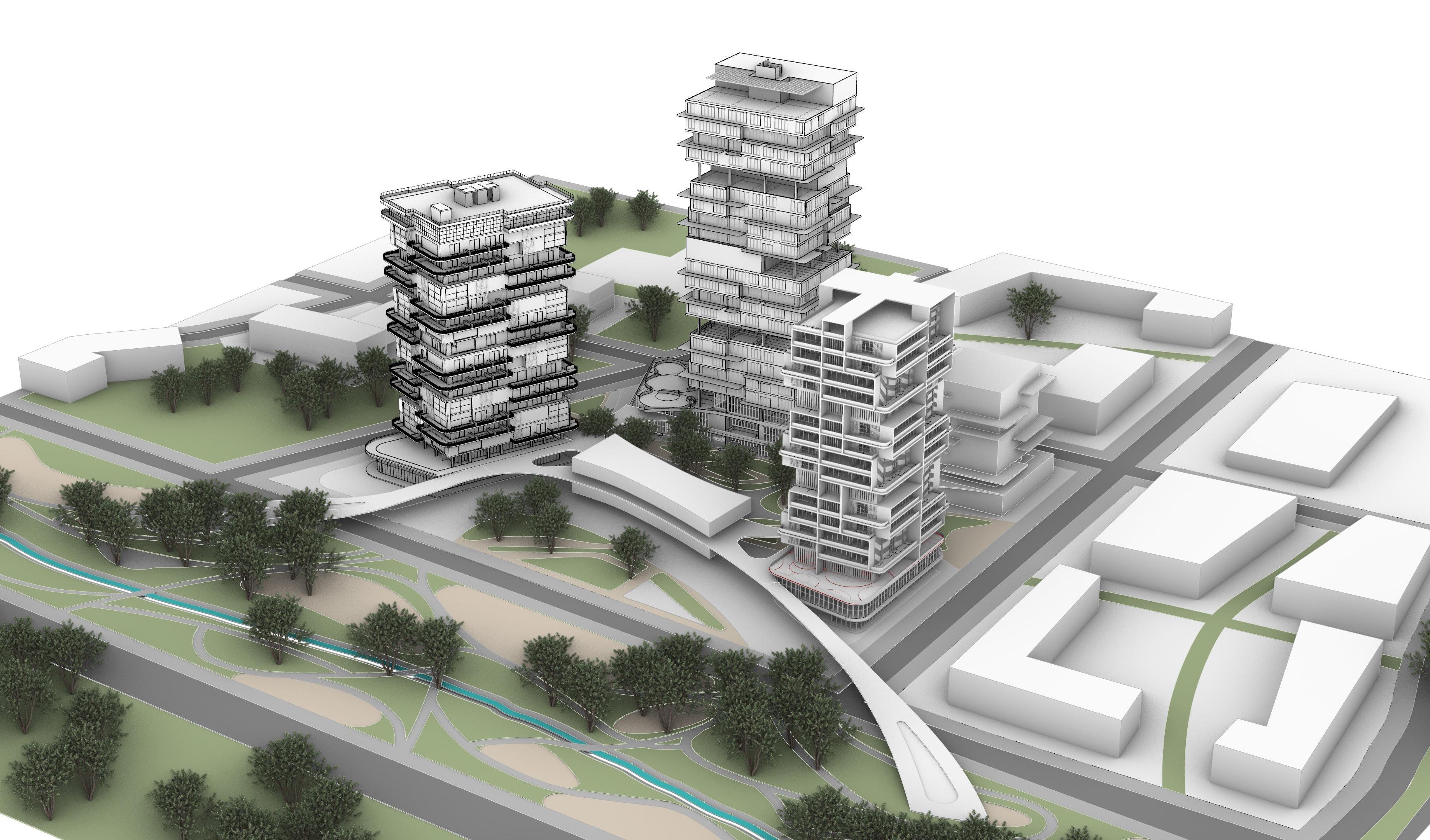 En el recinto se buscó integrar el sistema natural preexistente transformándolo en un parque lineal donde se vuelca la actividad hacia el río. Los edificios se abren a este parque y busca conexión con la malla roja de centralidades en la parte central de la célula, así mismo los edificios se conectan por medio de una plataforma que permite el intercambio de usos. por último. la configuración de estos edificios mas la plataforma, da como resultado un espacio para la integración de los distintos usuarios del recinto