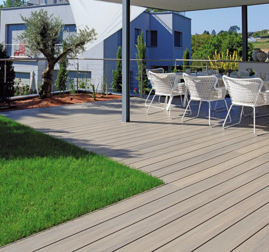 Die drei warmen Farbtöne imitiert perfekt das natürliche Aussehen und Farbspiel von Ipé-Holzdielen. Je nach Vorliebe können mehr gelbe oder braune Farbtöne bei der Terrasse hinzugefügt werden.
