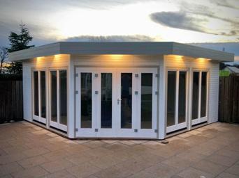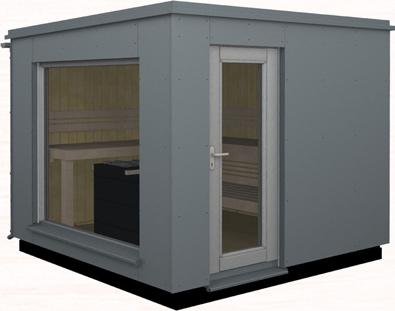 Gartensauna LUNA 1C mit Panoramafenster (144 x 162 cm), Aussenmass 228 x 227,2 x 245 cm (BxTx H), Aussenschalung mit wetterfesten HPL-Platten, 3 Liegen.