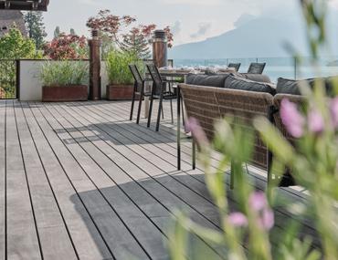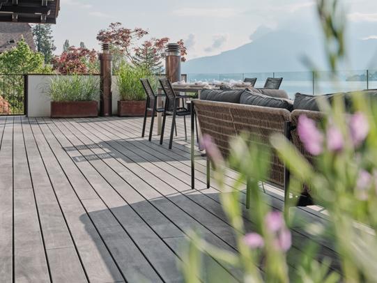 ACCOYA® Color Grey. Fast keine Splitterbildung und geringe Erwärmung = wahrhaft "barfussfreundlich". Kein Ölen nötig! 25 x 145 mm, Längen: 240/300/360/420/480 cm. Auf Bestellung mit kurzer Lieferfrist
