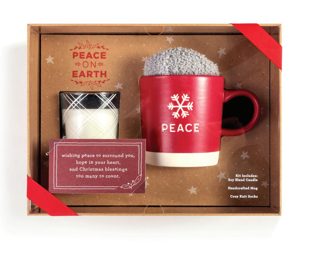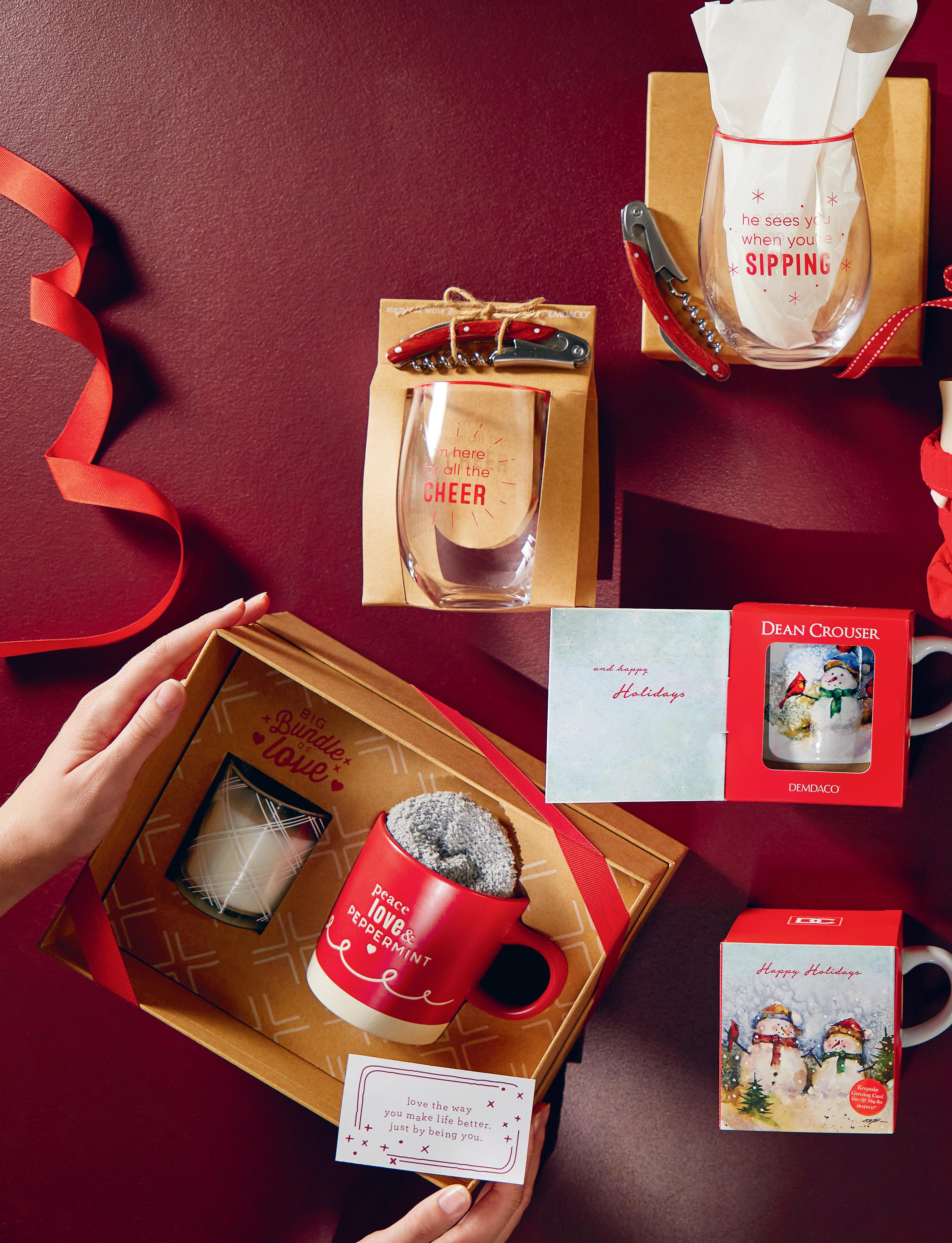Perfect for a teacher; just add treats! Perfect for him! From Left: A Big Bundle of Love Christmas Gift Box 2020220002, $53.50 | Here for Cheer Wine Glass & Corkscrew 2020220123, $29.75 | When Sipping Wine Glass & Corkscrew 2020220125, $29.75 | Snowmen Winter Scene Mug and Card Set 2020220255, $22.00 | Winter Friends Mug and Card Set 2020220254, $22.00 Joyful Heart Mug 1004470052, $22.00 | Dear You Cloche Ornament - Sister 2020220027, $17.75 | Good Cheers Pilsner Glass & Towel 2020220119, $29.75 Hoppy Christmas Pilsner Glass & Towel 2020220116, $29.75 Peace on Earth Christmas Gift Box 2020220003, $53.50 EXPLORE GIFT GUIDES FOR EVERYONE ON YOUR LIST. “Being