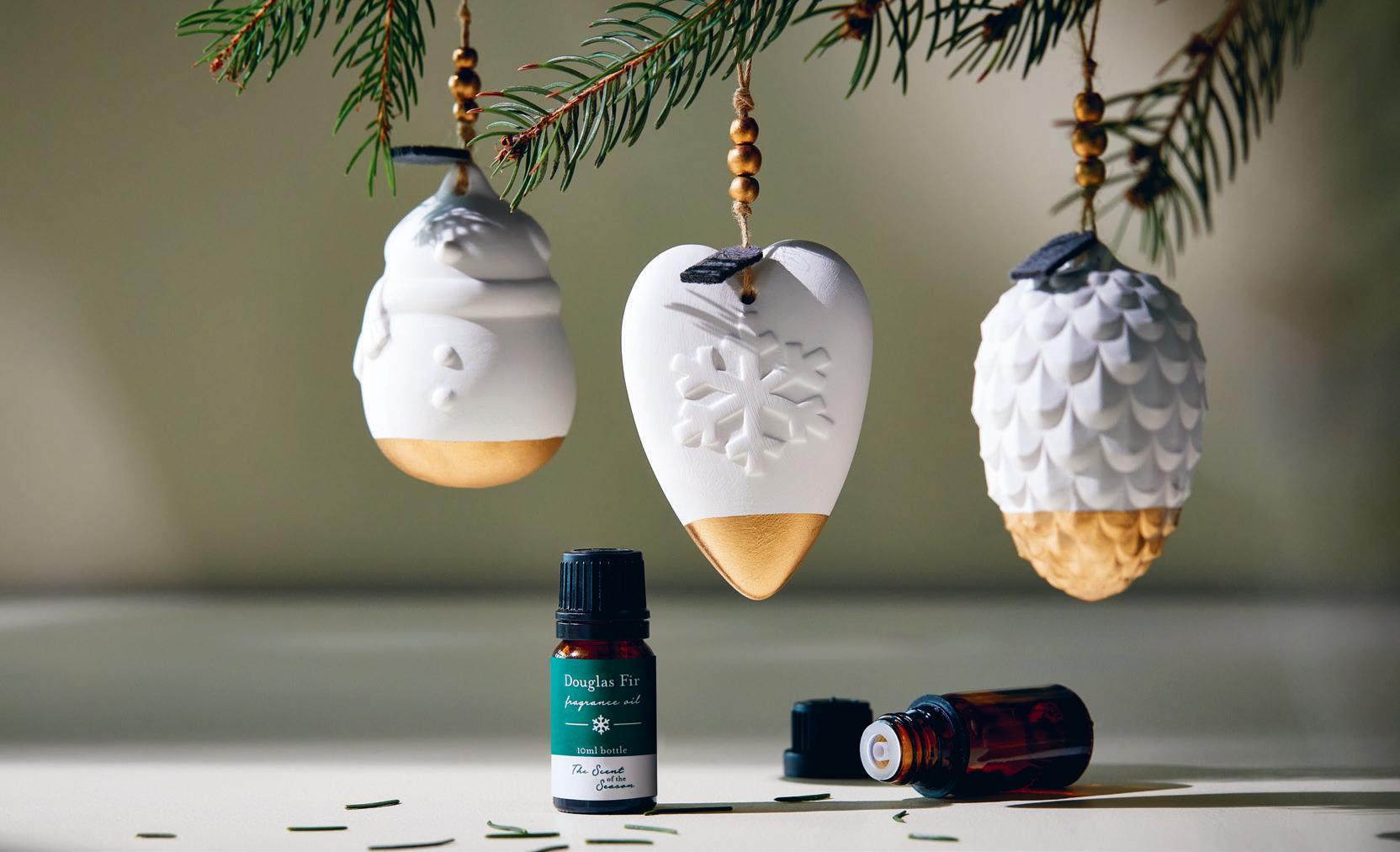 Left Page: Small Giving Candle - Thankful 1004440167, $22.00 Giving Candle - Cozy 1004440145, $33.00 | Right Page: Meditating in the Morning Candle 1004540084, $28.75 | Giving CandleRestore 1004440115, $33.00 | Snowman Fragrance Oil Diffuser Ornament , $22.75 | Snowflake Fragrance Oil Diffuser Ornament 2020220175, $22.75 | Pine Cone Fragrance Oil Diffuser Ornament 2020220168, $22.75 BROWSE AROMAS TO REFRESH YOUR SPACE. Add a few drops of scented oil to each diffuser and get some merry in the air.