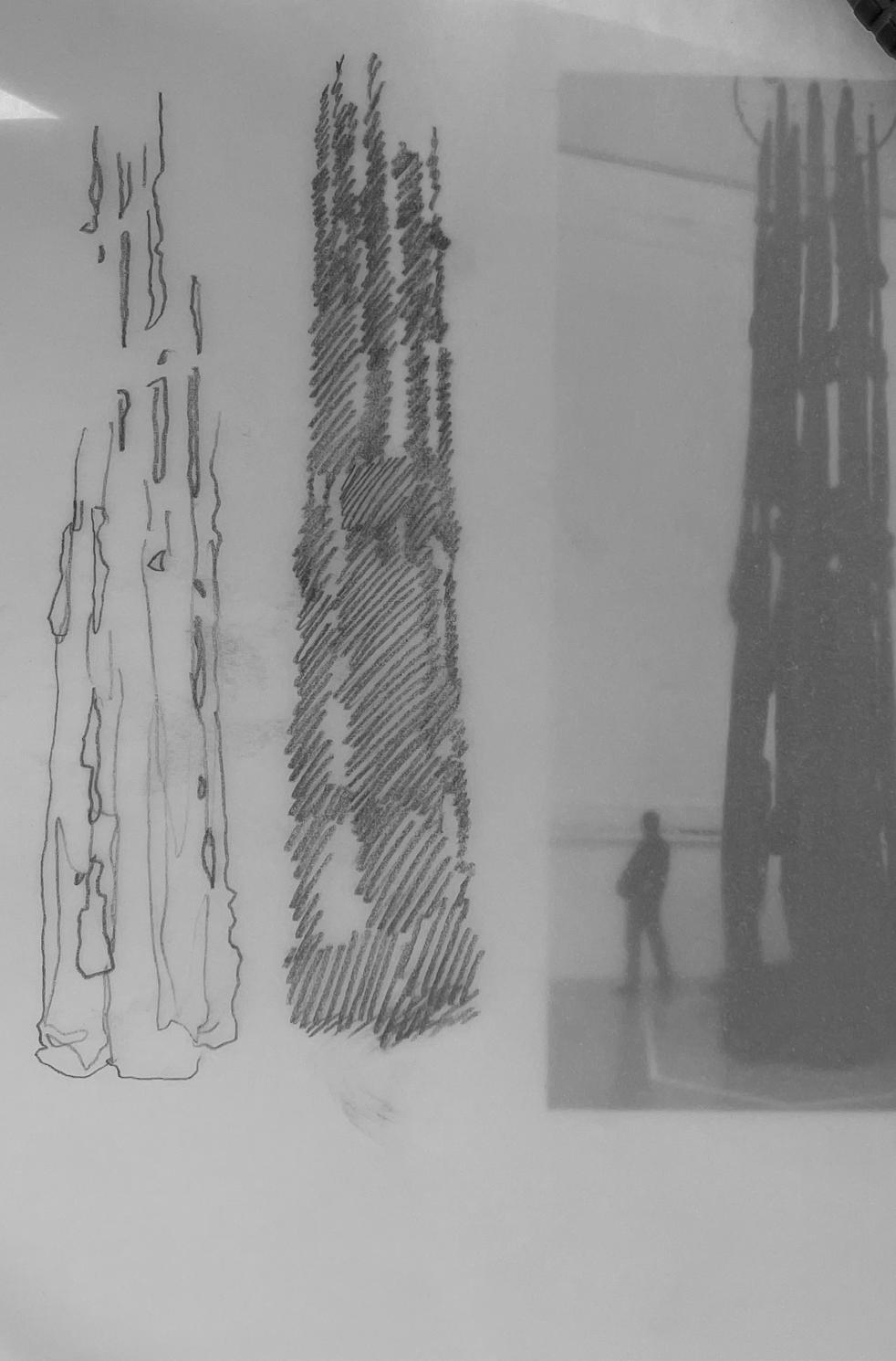 I decided to study Soulages, and researched the interplay between darkness and light in his work. It became clear that the gaps in between the, ususally, black ink had great impact on the volumes created, and played a major part making the pieces come to life. Inspired by Soulages, I did further studies through photography on ”inbetween” spaces of objects and shadows.