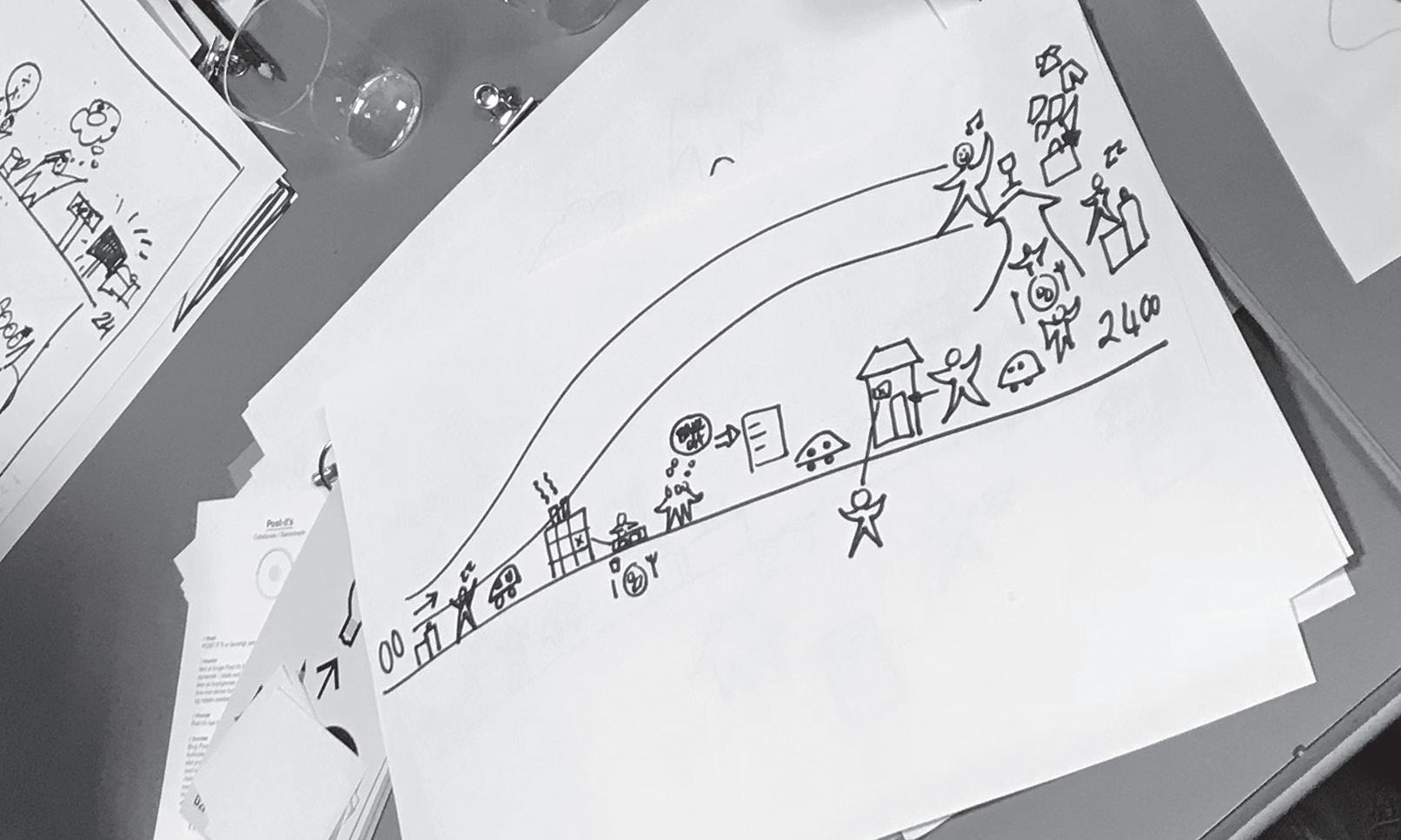 Summarize what you know about an idea/a concept by describing it with the words: what (the idea), who (the user), why (the need), how (the experience), when (the meeting with the user). Create visual images that describe these words. It can be sketches, icons, collages, photos, etc. You can also incorporate physical materials and models as a way to describe specific qualities even more clearly. In that way, all the senses are put into play.