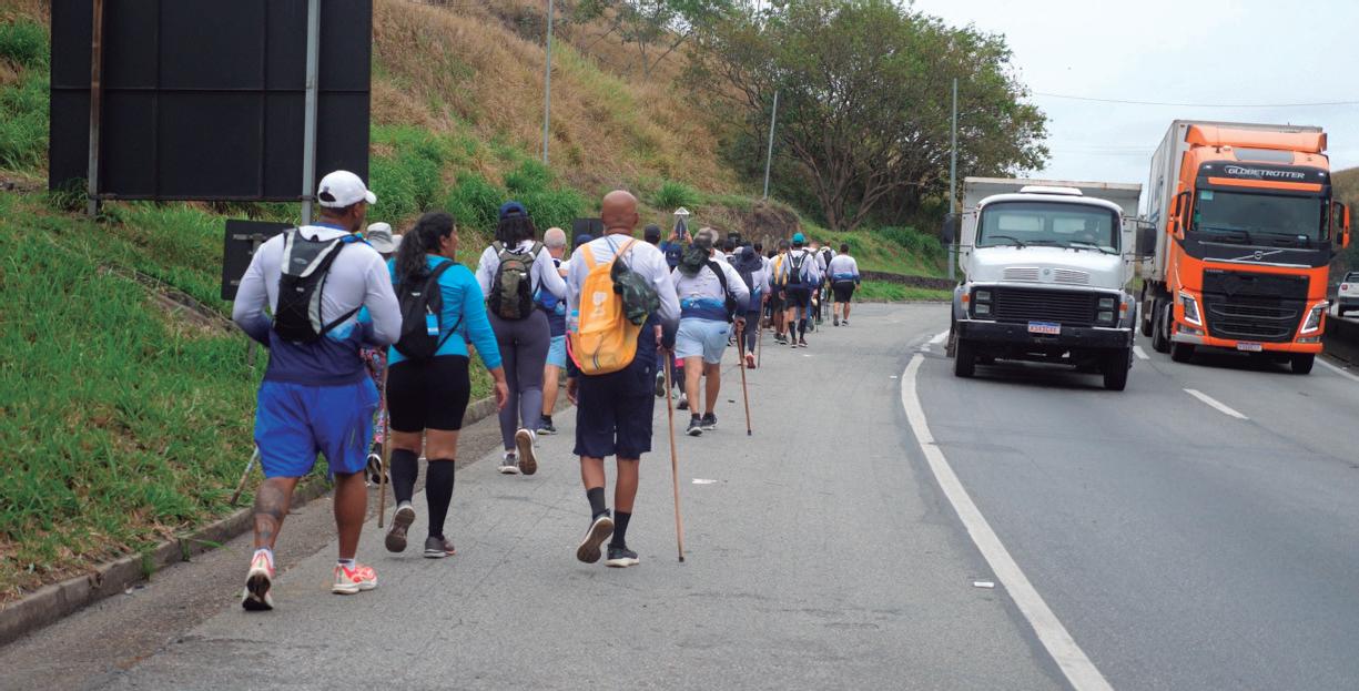 Com 50 participantes, o Grupo Caminhando com Maria saiu da Praça Brasil na madrugada de quarta-feira (8), rumo ao Santuário Nacional de Aparecida. Cada passo reflete fé e disciplina, com noites de quatro a cinco horas de sono e acompanhamento de veículos de apoio. A experiência combina espiritualidade e resistência física, mantendo viva a tradição da peregrinação anual. A CCR RioSP montou 19 tendas de assistência aos romeiros ao longo da Dutra, onde os peregrinos também recebem coletes refletivos, para melhorar a visibilidade. Ações de orientação são realizadas para que os fiéis sigam as instruções de segurança.