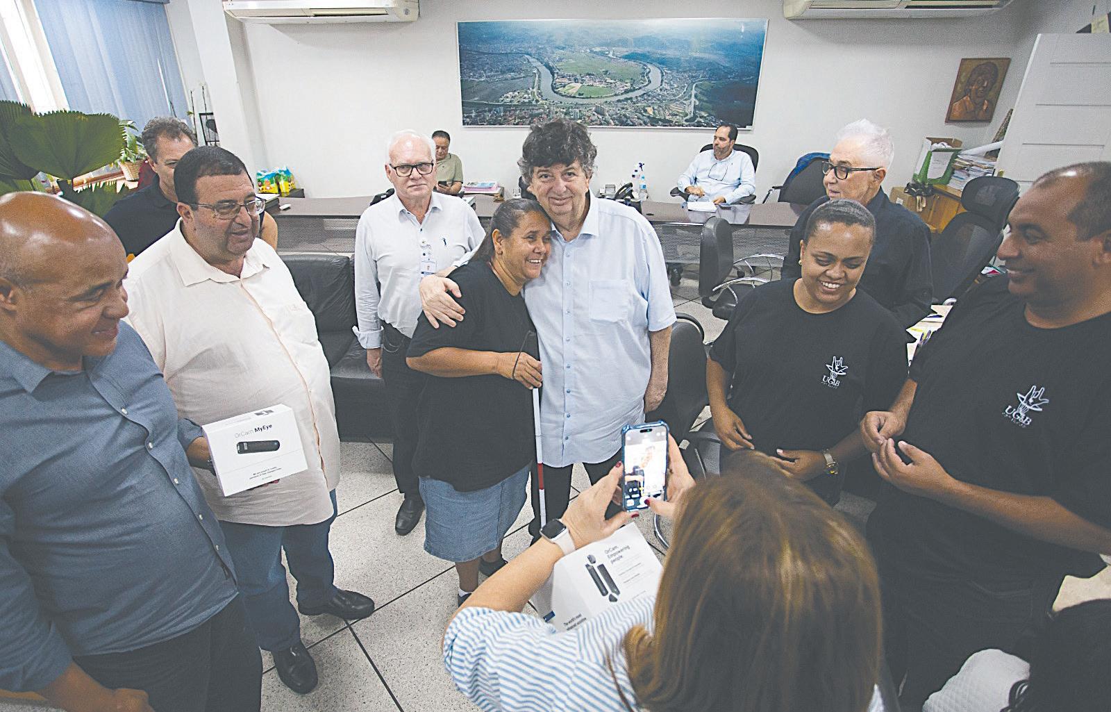 A Prefeitura de Volta Redonda entregou nesta quinta-feira (9) os primeiros óculos equipados com a tecnologia assistiva OrCam MyEye 2, que facilita a leitura de textos, identificação de objetos e cédulas, entre outras funções que promovem autonomia e inclusão social. A cerimônia foi realizada no Palácio 17 de Julho, em comemoração ao Dia Mundial da Visão 2025, celebrado anualmente pela Organização Mundial da Saúde (OMS). Os primeiros beneficiados foram quatro estudantes cegos do programa ‘Diploma Cidadão’, da Secretaria Municipal da Pessoa com Deficiência (SMPD), que cursam Administração e Psicologia no UGB (Centro Universitário Geraldo Di Biase).
