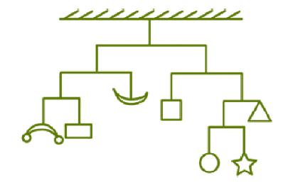 39 Een mobiel hangt mooi recht aan het plafond. Op elke plek is het mobiel in evenwicht. Gelijke figuurtjes zijn even zwaar. Een cirkeltje weegt 30 gram.