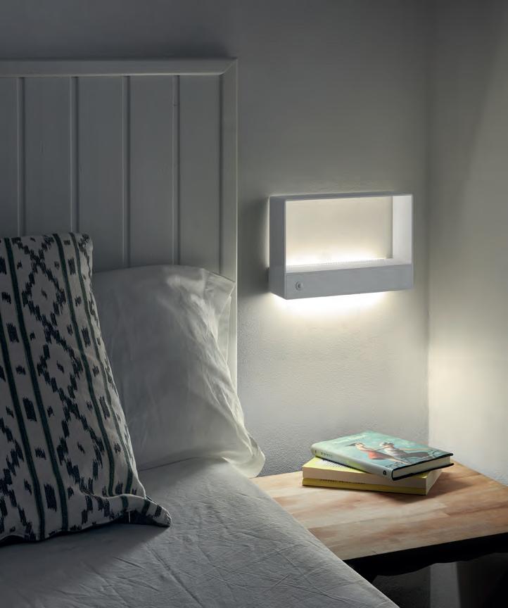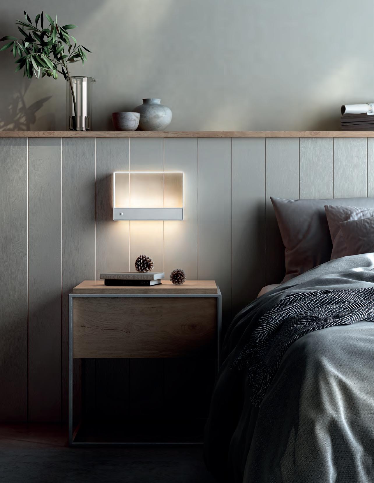 Los apliques Kira son una caja de luz que emite un aura de luminosidad cálida en el contorno de su perímetro interior. Además, emite luz inferior a través de una placa LED y puede disponer de un pulsador con 3 posiciones de regulación.