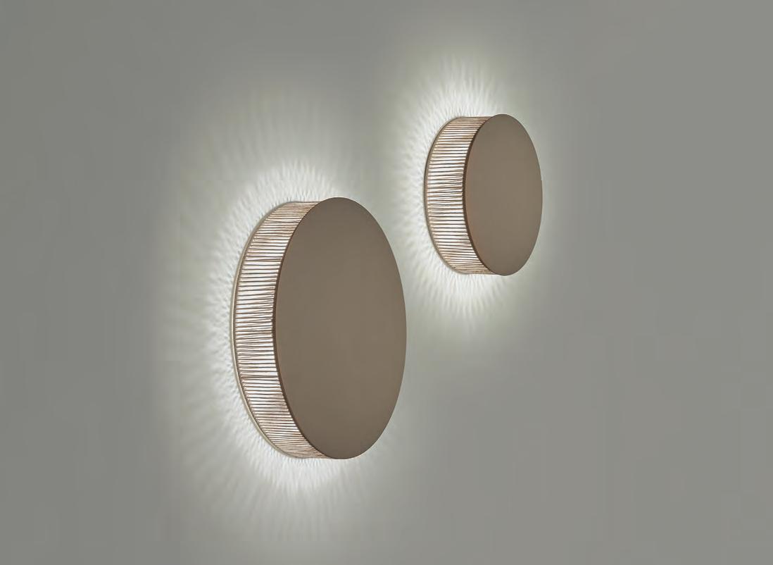 The Helios wall lamp is an artisan product that gives off indirect light through the irregular cotton threads of its lampshade, drawing small shadows on the wall. Helios comfortably adapts to the language and personality of organic environments and wabi-sabi aesthetics.