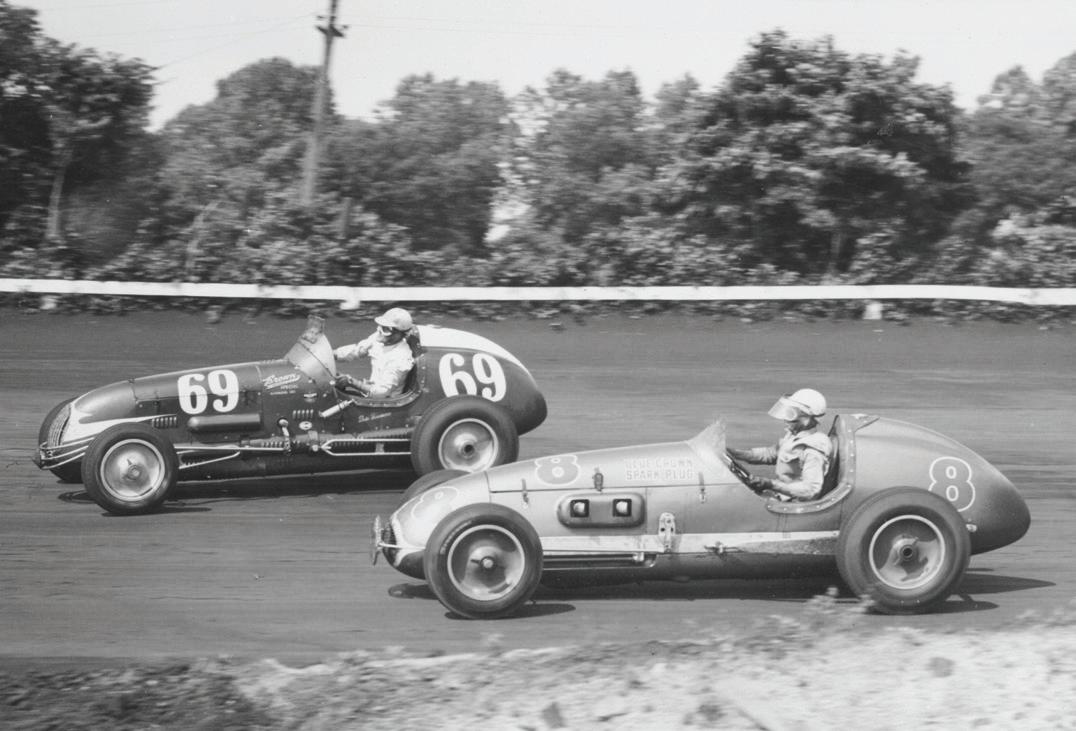 Henry (Lou Moore 8) battles Duke Dinsmore (69) at the treacherous Langhorne Speedway in 1950. Banks won the National Championship with consistent finishes and one victory at another treacherous track, Detroit, Michigan. Seeing great promise in his driver, Hopkins bought Banks a champ car for the 1950 racing season, with results coming immediately. Henry was consistently in the running with eight top fives, including a victory in the 100 miler at Detroit. All this resulted in Banks winning the 1950 National Championship. (Bob Mays collection)
