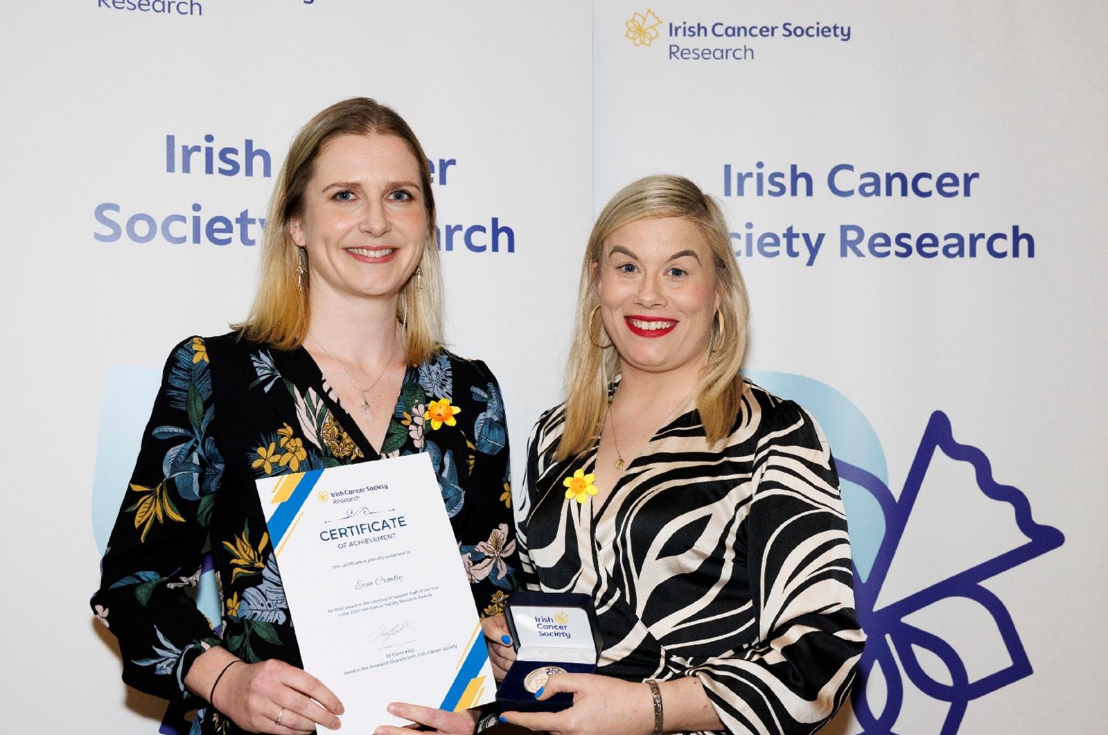 Congratulations to Dr. Erin Crowley on winning Support Staff of the Year Award at the recent Irish Cancer Society Research Awards pictured here with Dr. Claire Kilty, Head of Research, Irish Cancer Society.