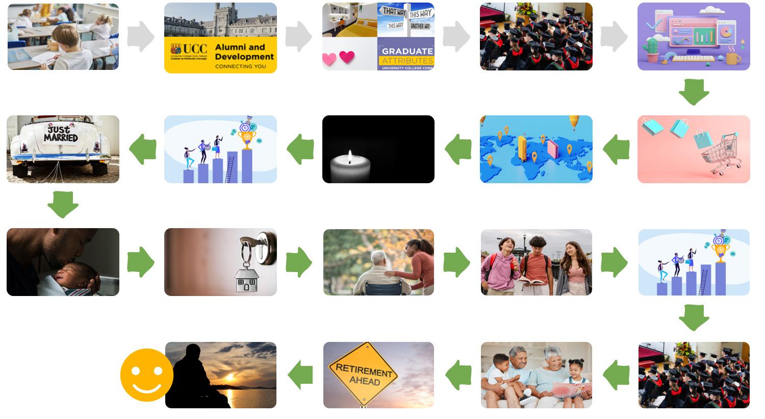Everyone has key milestones in life, those big memorable life-defining moments that show a life well lived… deciding if and where to go to university, meeting your best friend for the first time or falling in love; your graduation, your first job, first mortgage, first baby, dealing with bereavements; juggling family life with work which can include caring for children or elderly relatives. But before you know it you are attending open days with your teenage kids and supporting them as they become young adults, and the cycle of life continues. Our visual aid tool will aid our decision making in creating programmes that suit people at different stages of the life-course and ensure UCC has multiple touchpoints for our alumni before and after graduation.
