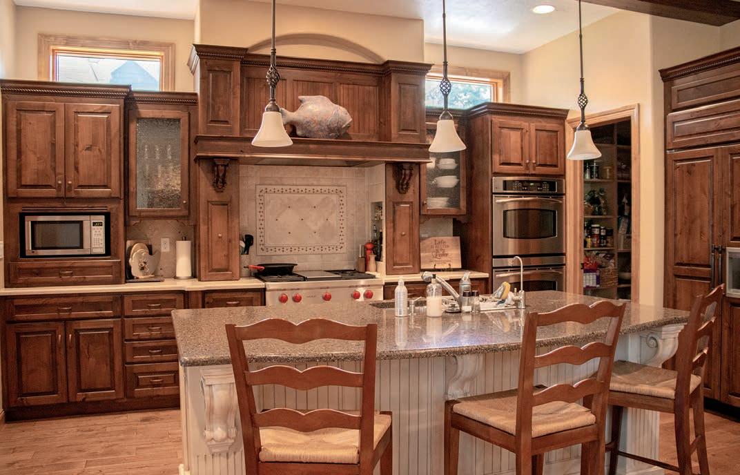 The kitchen includes an island, handcrafted wooden cabinets and a classic gas stove. The Peinoviches use the kitchen as a gathering space for when their family comes to visit. The kitchen table is their favorite place to hang out in the evening, using it as a gathering space for dinner and board and card games.
