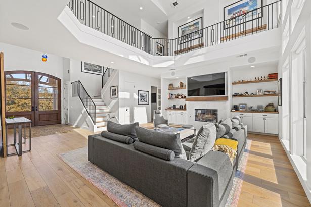 The two-story, 6,000-square-foot custom home showcases French white oak wide plank floors, a covered front porch, and a layout designed for both elegance and functionality Inside the main residence, the main level features a formal dining room with access to a wine room and wet bar, seamlessly flowing into a living room connected to a flawless kitchen Custom cabinetry, floating shelves, and unique lighting enhance the kitchen's allure. The downstairs also encompasses a breakfast room, media/game room, guest room with a full bathroom, oversized office, laundry room, and a specially designed dog room. Dual staircases lead to the second floor where you will find amazing views from all bedrooms & gym, including the luxurious master suite with a gas fireplace, sitting area, oversized master bath, and not one but two walk-in closets plus a laundry room.