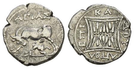 Veiled and wreathed head of Demeter to right / Z NTI , Poseidon seated to right on rock, holding aphlaston with right hand and transverse trident with left; in inner right field. Schönert-Geiss 1257-1262; HGC 3.2, 1428. 9.91gr, 26mm, 12h. Good Very Fine.