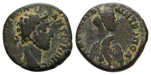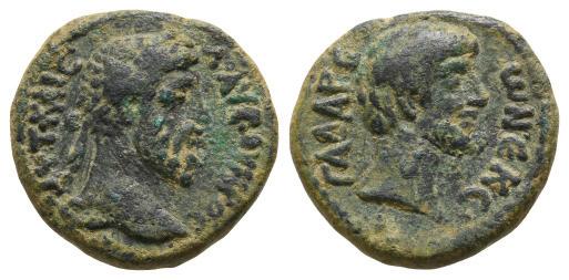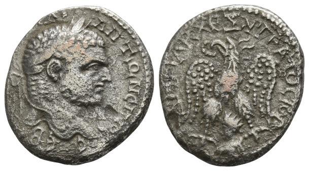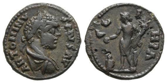 Diademed head of Serapis to right, wearing atef crown / [ YPAK]O-CIΩN, Isis standing facing, head to left, holding sistrum with right hand and sceptre with left. CNS II, 240 corr. (wreath); HGC 2, 1478. 8.63gr, 20mm, 12h. Good Fine.