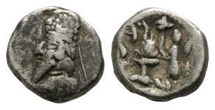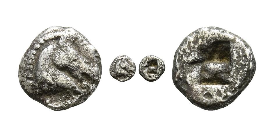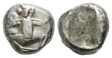 Forepart of horse galloping to right / Owl standing to right on thunderbolt, head facing; A to left. HN Italy 1439; HGC 1, 1016. 2.09gr, 12mm, 7h. Near Very Fine. Very rare. £40 - 60
