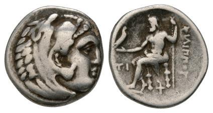 Imitating Alexander III and Philip III of Macedon. Degraded head of Herakles to right / Stylised Zeus seated to left, holding eagle in right hand and sceptre with left. Cf. Lanz 910-932. 15.30gr, 30mm. Fine. £40 - 60