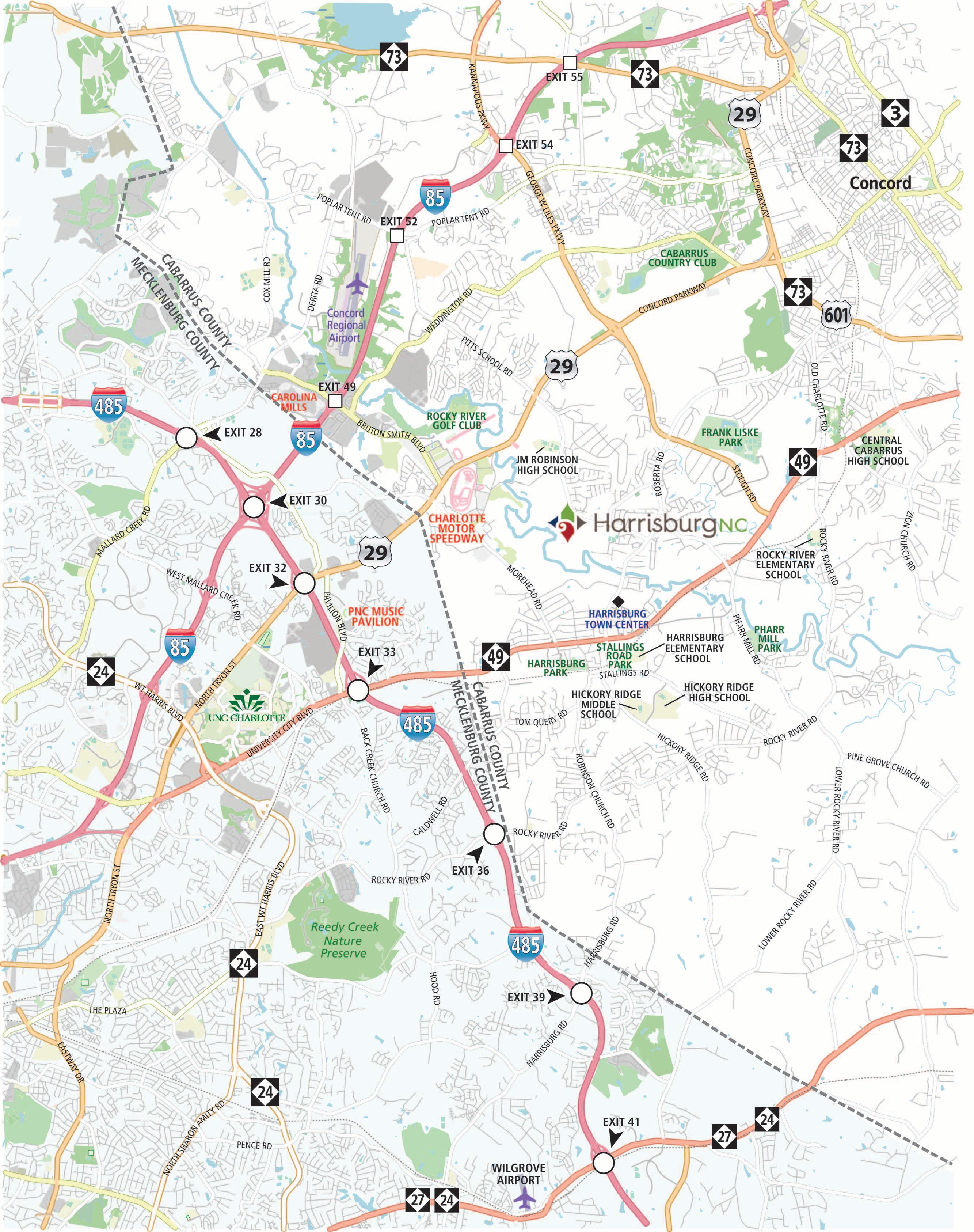 One of Harrisburg’s biggest strengths is its proximity to Charlotte and its interstate road system. The town’s central location in the state and proximity to Interstate 85 and Interstate 485 creates easy access from other destinations in the mid-Atlantic/southeastern region. Interstate 77 is just 15 miles west and Interstate 40 just a 30 minute drive north. NC Highway 49 passes through the center of Harrisburg, leading northeast to Asheboro and southwest to the hub of Charlotte.