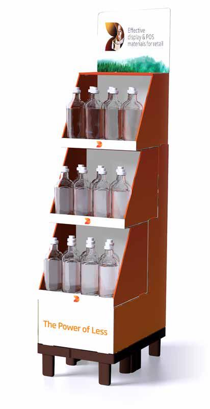 Varerne er opstillet forskudt, hvilket giver stor synlighed og samtidig er de understøttet af en stærk indvendig konstruktion. Trappedisplayet bliver derfor ofte brugt til flaskevarer.