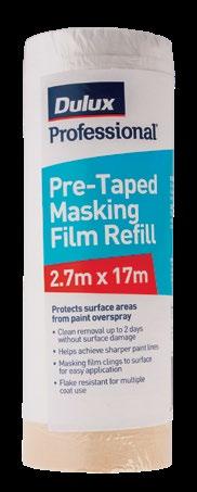 Stainless steel ferrule » Suitable for all paints If you can’t find any of these catalogue items in store, let one of our friendly team members know. We'll get it in for you at no extra cost to your closest Dulux Trade Centre, Inspirations Paint or Paint Spot store as soon as possible. WEBINAR TAX TIME TIPS Register here Tuesday 25th June 2024 2090 Scotch Blue Masking Tape 36mm 6 Pack » 14 day clean removal with no sticky residue » Convenient 6 pack tower SAVE $7.90 WAS $52.90 $45. 00 6PK Washi Tape Roll 36mm » Super sharp paint lines to resist bleed through » 60 day clean removal » Made in Japan $147. 20 CARTON OF 16 INDIVIDUAL BUY PRICE $9.20 SAVE $36.80 Pre-Taped Masking Film Refill 2700mm x 17m » Clean removal up to 3 days without surface damage » Protects against overspray and paint splatter Also available: Dulux Professional PreTaped Film 1.8m x 33m Refill $6.60 (WAS $8.90) SAVE $2.30 30% OFF For T&Cs visit duluxtrade.com.au Promotion dates: 1st - 30th June 2024 4 X POINTS 4 X POINTS THE ENTIRE RANGE SAVE $2.70 WAS $10.50 $7.80