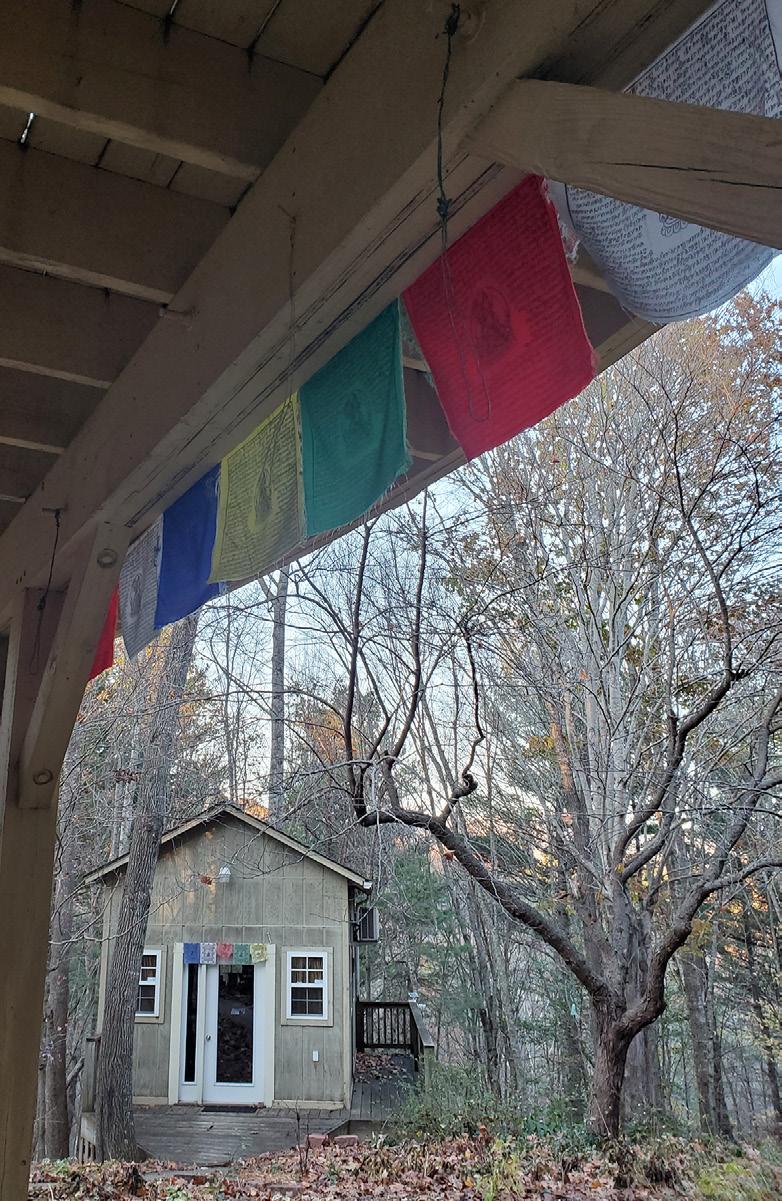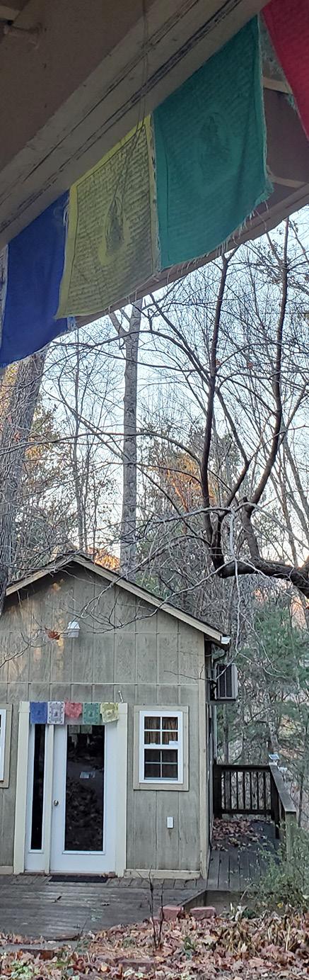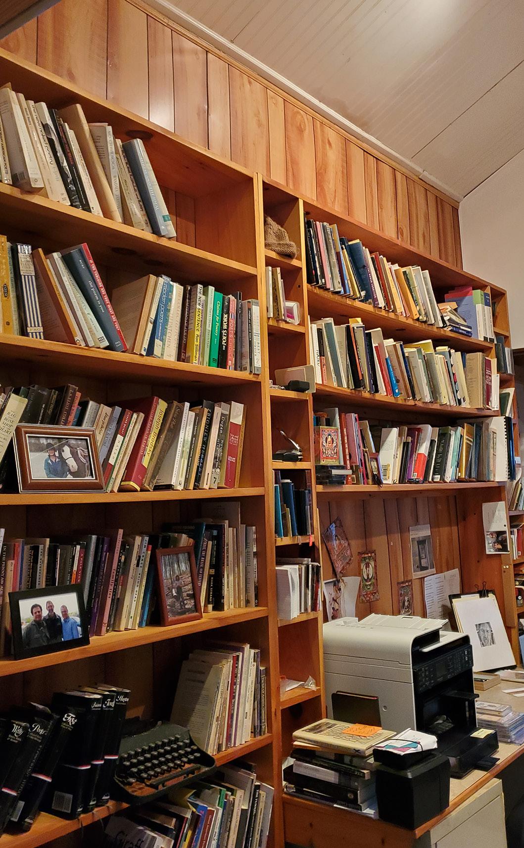 Hale opens the sliding glass door, leads me past a clothesline of prayer flags down the path to Mc’s writing shed. To one side of the path is a small fire pit surrounded by stones, perhaps a place to meet, a place to think, a place to play the blues. It’s just over a year since Mc died, leaving behind his “glimpses, glyphs, & found novels” and an army of adoring friends and students. I’m expecting answers in the book titles lining his shelves. Will there be a Buddha’s head, art on the walls, a comfortable chair? Hale opens the door. We step inside. I find only a warm silence. n
