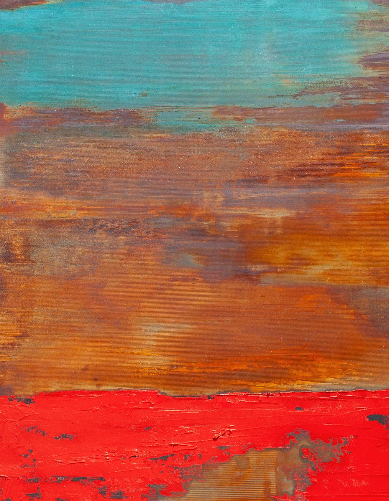 Teal Canyon Diptych (oxidation paint and wax on wood panel, 48x20) by Willie Little