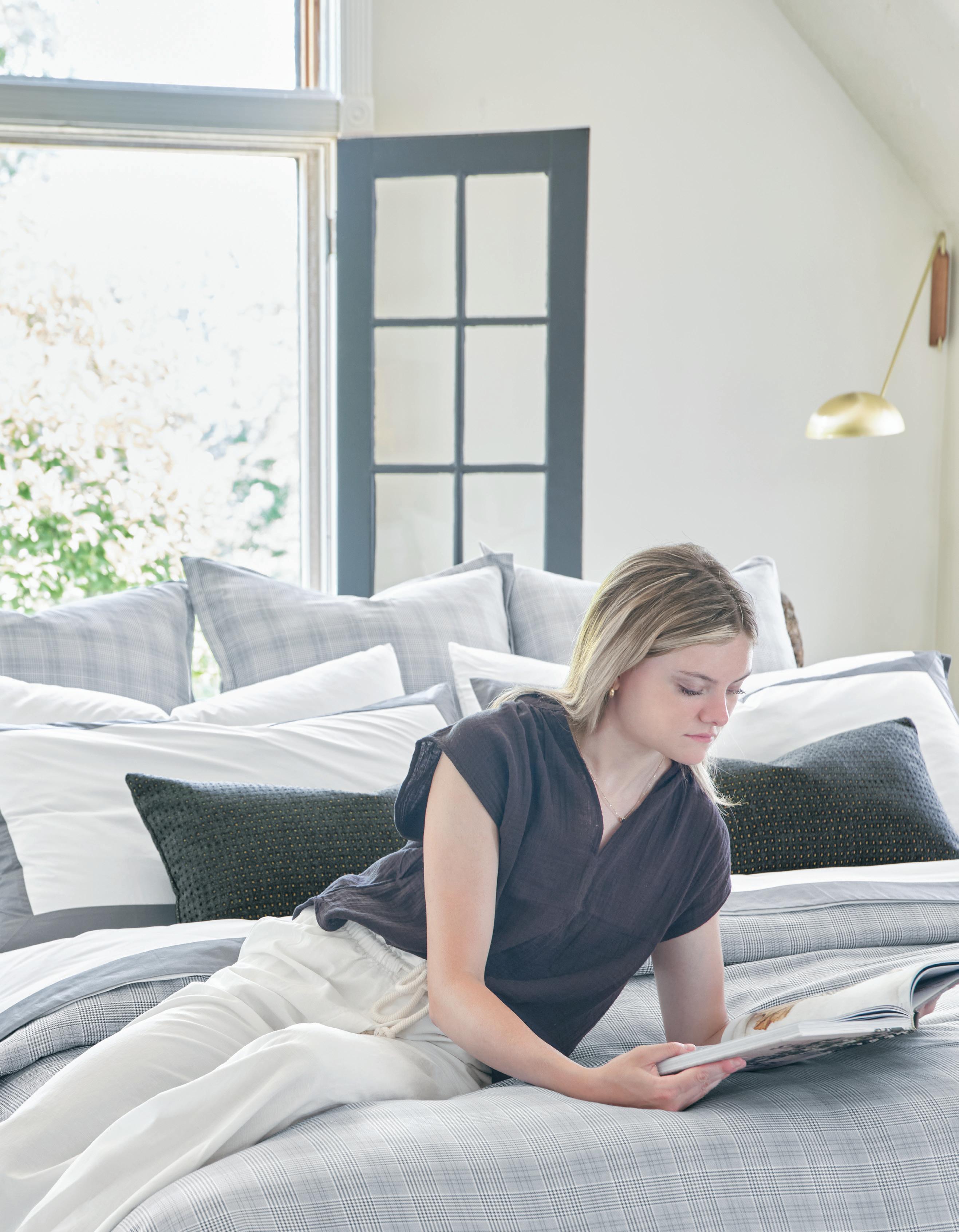 Create a handsome master bedroom aesthetic with striking Octavius. Inspired by traditional men’s suiting, this debonair collection features houndstooth plaid in 100% tencel and percale sheeting with a contrasting edge. Complete this tailored look with Octavius’ wool-mix decorative pillow, featuring a burned-out square pattern.