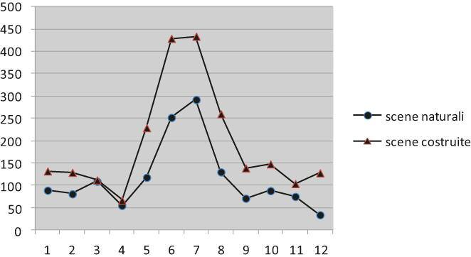 Grafico 3: confronto fra il numero medio di fissazioni (rilevate ogni 40 ms per un intervallo di osservazione di 15 s) per le scene naturali e costruite, misurate per le 12 sezioni di un’immagine (sezione 1: in alto a sinistra, sezione 12: in basso a destra) Le differenze tra le sezioni 5-10 e 12 sono significative (p > .001). (Fonte: adattato da Berto, Massaccesi e Pasini, 2008)