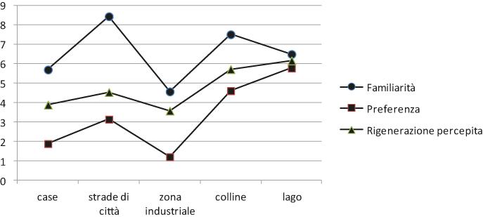 Grafico 2: andamento dei punteggi di rigenerazione percepita di adolescenti, giovani adulti e anziani per 5 diverse categorie ambientali (Fonte: adattato da Berto, 2007)