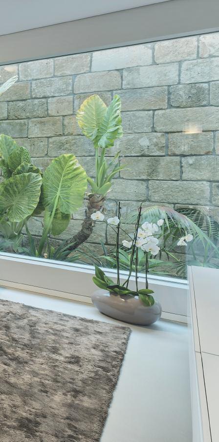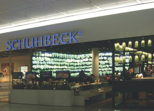 Nella pagina a fianco, in basso: esempio di luce naturale e diffusa, di legame con i sistemi naturali e di stimolazione sensoriale non ritmica in ambiente interno Soffitto della hall del resort Aria (Las Vegas, NV -USA) Qui sotto a sinistra, esempio di contatto visivo con la Natura e legame con i sistemi naturali in un ambiente interno, ristorante Schuhbeck all’interno dell’aeroporto di Monaco di Baviera (D) La presenza di elementi naturali favorisce il benessere dei viaggiatori e consente loro di vivere una “micro” esperienza rigenerativa dalla fatica del viaggio Qui sotto, esempio di struttura biomorfica, una delle pareti del ristorante di pesce “Fin”all’interno dell’Hotel Bellagio (Las Vegas, NV -USA)