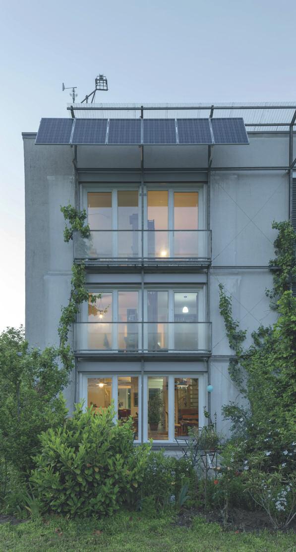 Che cosa aveva detto, quella volta, la sua famiglia riguardo al fatto che lei volesse costruire una casa in modo ‘alternativo’? Erano anche loro entusiasti come lei? Costruire una casa è già di per sé snervante e richiede molto impegno. Un progetto pionieristico ancora di più… Entrambi i nostri figli erano ancora piccoli ed eccitati riguardo a tutto ciò che accadeva intorno a loro Mia moglie Witta è stata un’attrice attiva del progetto fin dall’inizio; in fin dei conti, abbiamo completato assieme la maggior parte del nostro processo conoscitivo I nonni erano in effetti un po’ scettici ma ben disposti verso questa ‘idea balzana’ e ci hanno supportati per quanto hanno potuto E questo è giusto: dovevamo passare attraverso lo sforzo e lo stress assolutamente ‘normali’ di un processo costruttivo. E il fatto che volessimo costruire in un modo che era ‘diverso’ dal solito metodo non ce l’ha reso più facile. Ma abbiamo anche avuto dei supporti: gli architetti prof. Bott, Ridder e Westermeyer hanno dato forma praticamente a tutti i nostri desideri (solo verso la fine ci hanno preso un po’ in giro per i principi osservati in modo tanto rigoroso). L’IWU (Institut Wohnen und Umwelt - Istituto tedesco per l’Abitare e l’Ambiente) ha condotto una ricerca associata che accompagnasse il processo e che è stata finanziata dal Ministero dell’Economia del Bundesland dell’Assia.