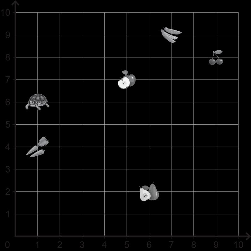 a) Indique les coordonnées des aliments qui se trouvent dans le /6 vivarium de la tortue