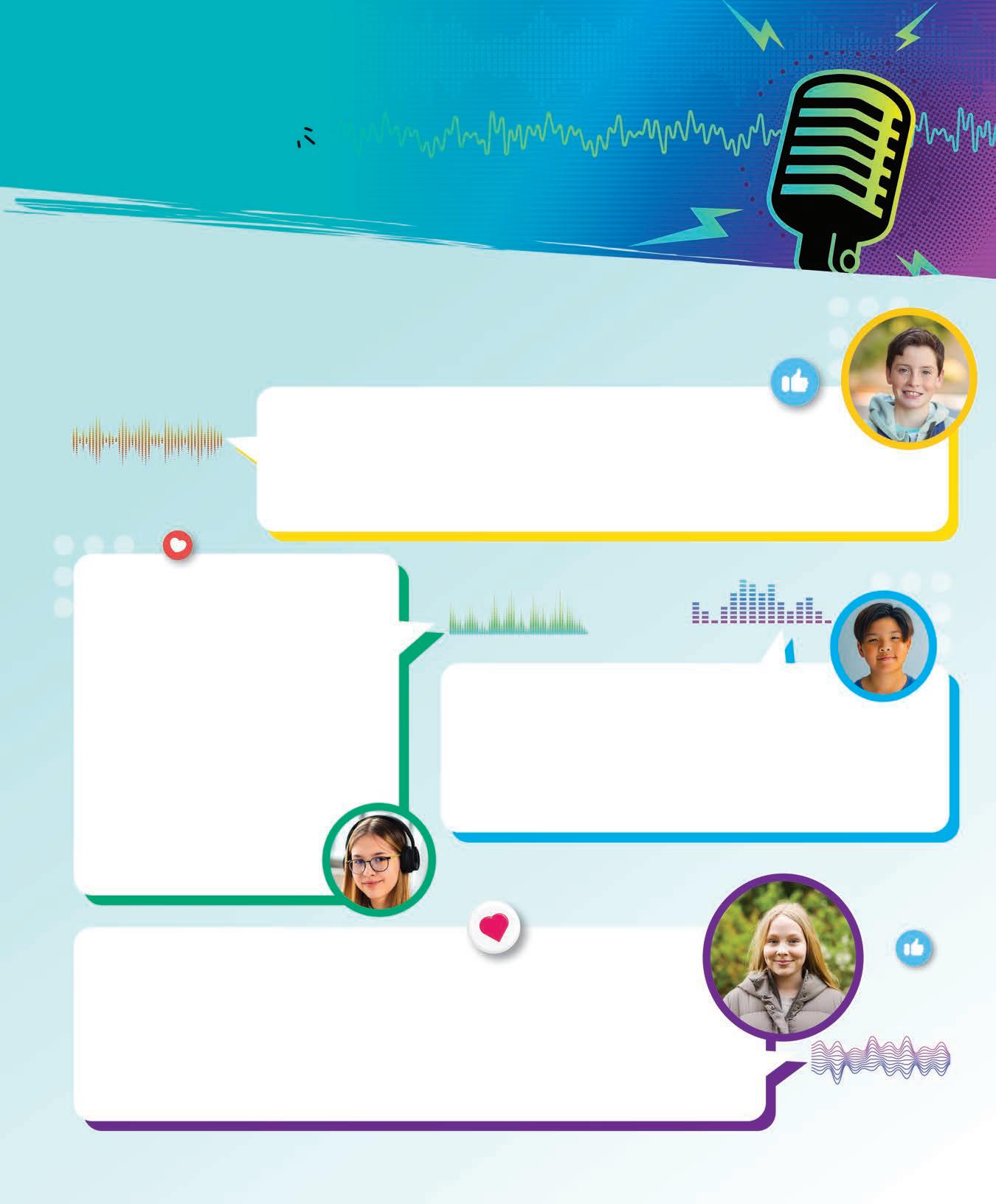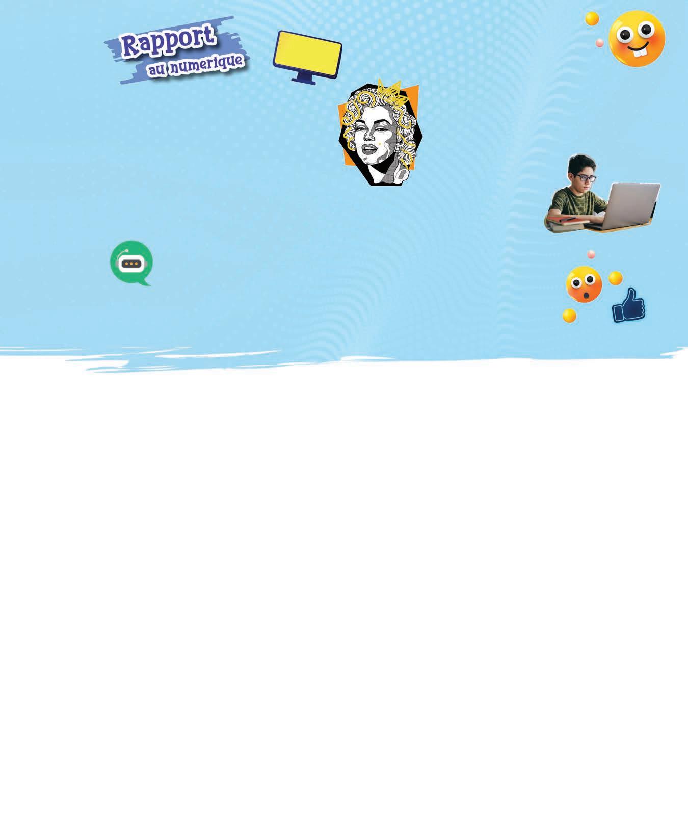 p. C2, 4 : Marilyn Monroe © iku4. p. C2, 14, 15, 16, 22 : émojis © Darko 1981. p. C2, 16, 22 : pouce en l’air © mivgor. p. 1 : rubriques : maillet, point d’interrogation, porte-voix © Devita ayu silvianingtyas. p. 3 : dés © Dmitry Demidovich. p. 4 : enfant et ampoule © Roman Samborskyi. p. 5 : icônes non genrées © Anastasiia Usenko ; garçon avec tuque © ViDI Studio ; main et cellulaire © HobbitArt. p. 6 : main robot © Summit Art Creations. p. 7 : main robot et ordinateur © Summit Art Creations ; assistant vocal © Rashad Ashur. p. 8, 9 : ligne et point © Marina Sun. p. 10, 11 : phylactères et points d’interrogation © Blan-k. p. 12 : fond abstrait © Stocklekkies ; flèches noires © gravity_point. p. 13, 22 : nuage © Trienovita ; icônes médias sociaux © Djoyotrue. p. 14 : cellulaire et porte-voix © Darko 1981. p. 15 : chambre d’écho © desdemona72. p. 17 : micro © z3r0graphic ; son multicolore © Vectorbum. p. 23 : icônes jaunes © THoNpHaK ; icône emoji casque © artskill2k17. p. 24 : lettres © ANNA_KOVA. p. 25 : calepin sondage © e.s design.