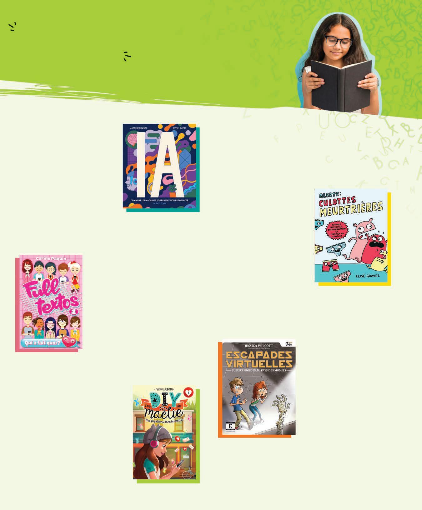 Autres p. 10, 11 : Camille Besse © Camille Besse ; Pierre Gravel © Pierre Gravel. p. 24 : IA : Comment les machines pourraient nous remplacer © La Pastèque ; Full textos : Qui a fait quoi ? et Les DIY de Maélie : Des papillons dans le ventre © Boomerang ; Alerte : culottes meurtrières – Fausses nouvelles, désinformation et théories du complot © Éditions Scholastic ; Escapades virtuelles : Sueurs froides au pays des momies © Éditions FouLire.