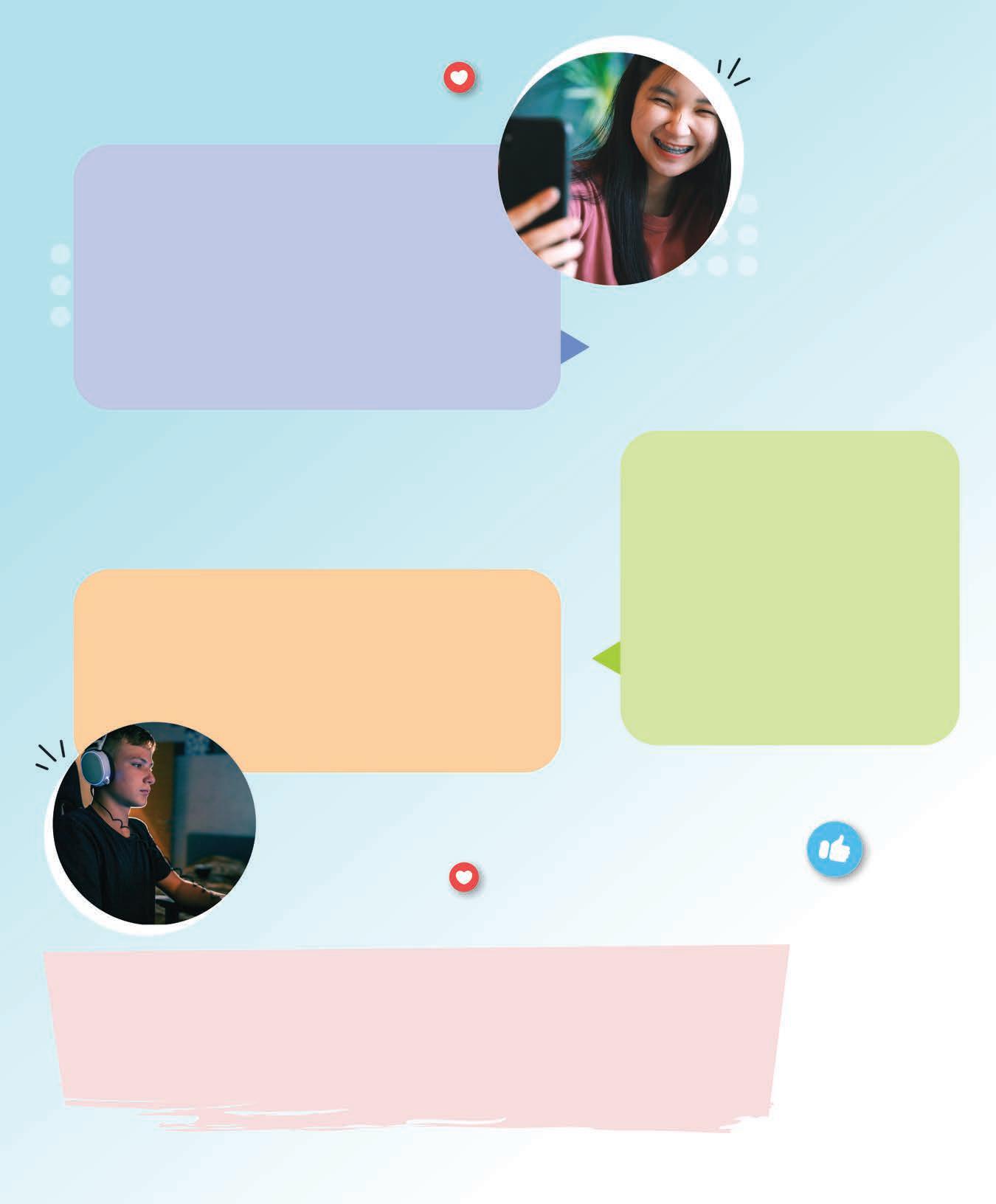 p. C2, 12 : icônes médias sociaux © Djoyotrue. p. C2, 2, 6, 7, 12, C4 : cœur et j’aime © Seymont Studio. p. C2, 10, 11 : phylactère et points d’interrogation © Blan-k. p. C2, 20, 21 : émojis humeur © Toxa2x2. p. 1 : rubriques : maillet, cœur, point d’interrogation, porte-voix © Devita ayu silvianingtyas. p. 2 : main et j’aime © Roman Samborskyi. p. 3, 4, 5 : losanges © Lauritta. p. 4 : téléphone et lignes © Roman Samborskyi ; émojis © RoseStudio. p. 5, 13 : icônes non genrées © Anastasiia Usenko. p. 5 : bouches et avatar © klyaksun. p. 6 : fille et phylactères, fille confettis © Roman Samborskyi ; garçon égoportrait © Nomad_Soul. p. 7 : fille égoportrait © Nuchylee. p. 12 : fille © Asier Romero. p. 13, 22 : icônes reliées © tutti_frutti. p. 13 : cinq enfants © Prostock-studio. p. 14 : clavier © Happy Stock Photo ; émoji sommeil © Kim_chen ; fille © Roman Samborskyi ; points d’exclamation © Polina Tomtosova. p. 15 : cerveau © PaleStudio. p. 16 : barre d’énergie © katsuba_art ; ampoule © vectorplus. p. 16, 17 : cadran et icônes sécurité © Blan-k ; garçon et flèches © Ground Picture. p. 18 : garçon © Popel Arseniy. p. 20 : cellulaire © NazArt. p. 23 : cellulaire et icônes © ra2 Studio ; icônes dessins © Receh Lancar Jaya ; icônes résultats © Perfect Vectors. p. 24 : garçon qui lit © New Africa ; lettres © ANNA_ KOVA. p. 25 : phylactères © renko_art ; icônes de haut en bas © Madiha Shaheen ; © jakkapan ; © Nikolamirejovska ; © Bradericon ; © HuHu ; © Yan-Go.
