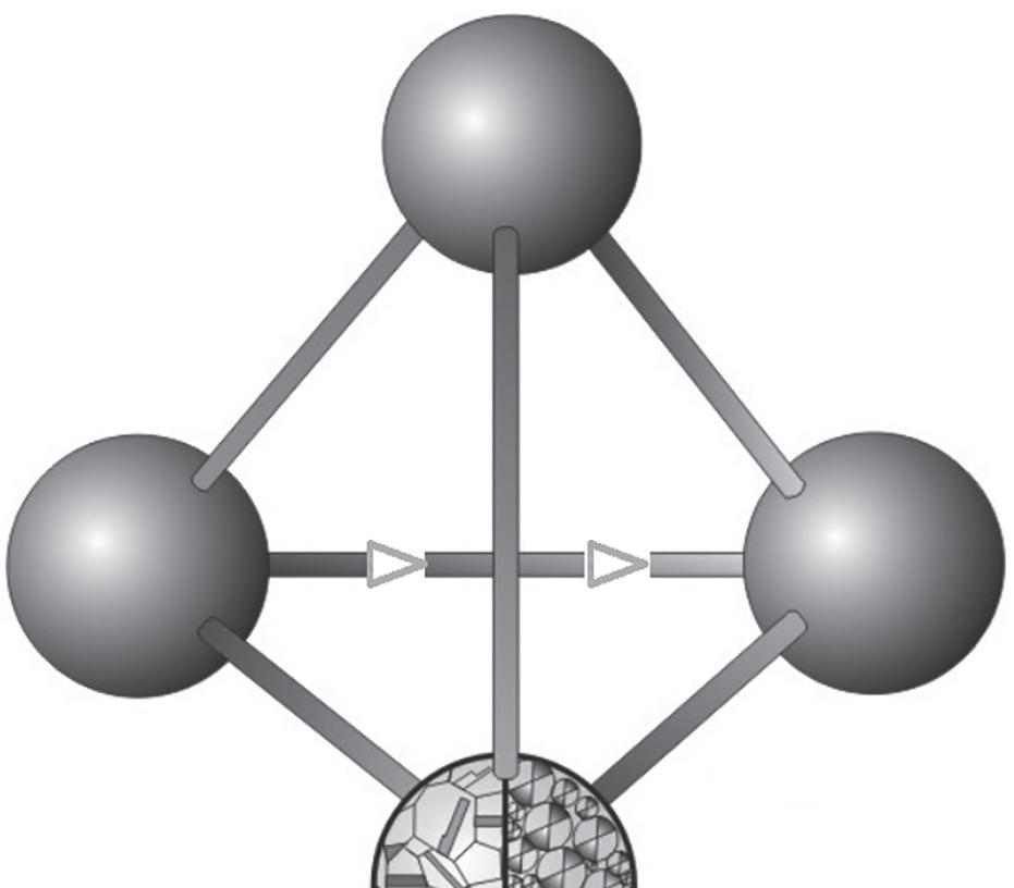 Figura 1.1 Tetraedro dos materiais, que pode ser usado para o entendimento do desempenho de componentes obtidos no âmbito da M/P, seja ele um produto compactado uniaxialmente e sinterizado, seja manufaturado aditivamente por impressão 3D.